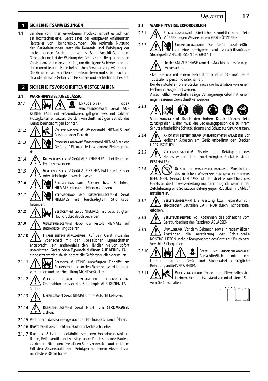 Bei dem von Ihnen erworbenen Produkt handelt es sich um ein hochtechnisiertes Gerät eines der europaweit erfahrensten Hersteller von Hochdruckpumpen. Die optimale Nutzung der Geräteleistungen setzt die Kenntnis und Befolgung der nachstehenden Anleitungen voraus. Beim Anschließen, beim Gebrauch und bei der Wartung des Geräts sind alle gebührenden Vorsichtsmaßnahmen zu treffen, um die eigene Sicherheit und die der in unmittelbarer Nähe befindlichen Personen zu gewährleisten. Die Sicherheitsvorschriften aufmerksam lesen und strikt beachten, da andernfalls die Gefahr von Personen- und Sachschäden besteht.