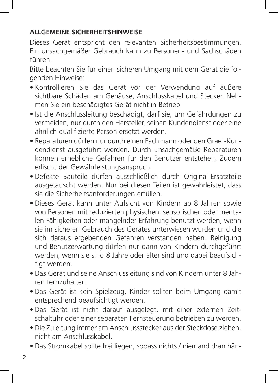 - Reparaturen dürfen nur durch einen Fachmann oder den Graef-Kundendienst ausgeführt werden. Durch unsachgemäße Reparaturen können erhebliche Gefahren für den Benutzer entstehen. Zudem erlischt der Gewährleistungsanspruch.