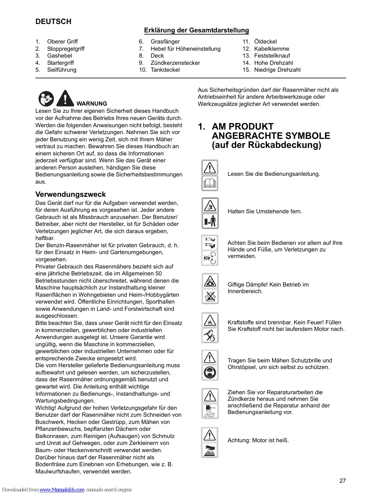 Cet appareil ne saurait être utilisé que pour les tâches pour lesquelles il a été conçu. Toute autre utilisation sera considérée comme une mauvaise utilisation. L’utilisateur/ opérateur (non pas le fabricant) sera tenu responsable de tout dommage matériel ou corporel de toute sorte en résultant. La tondeuse thermique est conçue pour un usage privé, à savoir dans un environnement domestique et pour le jardinage. Par usage privé de la tondeuse, on entend une durée de fonctionnement annuelle ne dépassant pas généralement 50 heures pendant lesquelles la machine est principalement utilisée pour entretenir de petits jardins, des pelouses résidentielles et des jardins particuliers ou familiaux. Les installations publiques, les terrains de sport et les applications agricoles ou forestières sont exclus. Veuillez noter que notre appareil n’a pas été conçu pour des applications commerciales, professionnelles ou industrielles. Notre garantie sera nulle et non avenue si la machine est utilisée dans des activités commerciales, professionnelles ou industrielles, ou à des fins équivalentes. Le mode d’emploi fourni par le fabricant doit être conservé et consulté afin de garantir que la tondeuse sera correctement utilisée et entretenue. Les instructions renferment des informations précieuses sur les conditions de fonctionnement, d’entretien et de dépannage. Important ! En raison du risque élevé de blessures corporelles pour l’utilisateur, la tondeuse ne saurait être utilisée pour couper des buissons, des haies ou des arbustes, pour couper des plantes grimpantes, des toits végétalisés ou de l’herbe poussant sur balcon, pour nettoyer (aspirer) la poussière et les débris des trottoirs ou pour couper des arbres ou les résidus de haie. En outre, la tondeuse ne saurait être utilisée comme motoculteur pour aplanir des zones élevées comme les taupinières. Par mesure de sécurité, la tondeuse ne saurait être utilisée comme unité d’entraînement pour d’autres outils de travail ou kits d’outil de toute sorte.