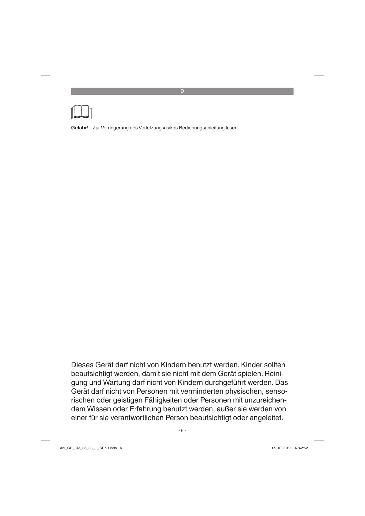 D Gefahr! - Zur Verringerung des Verletzungsrisikos Bedienungsanleitung lesen