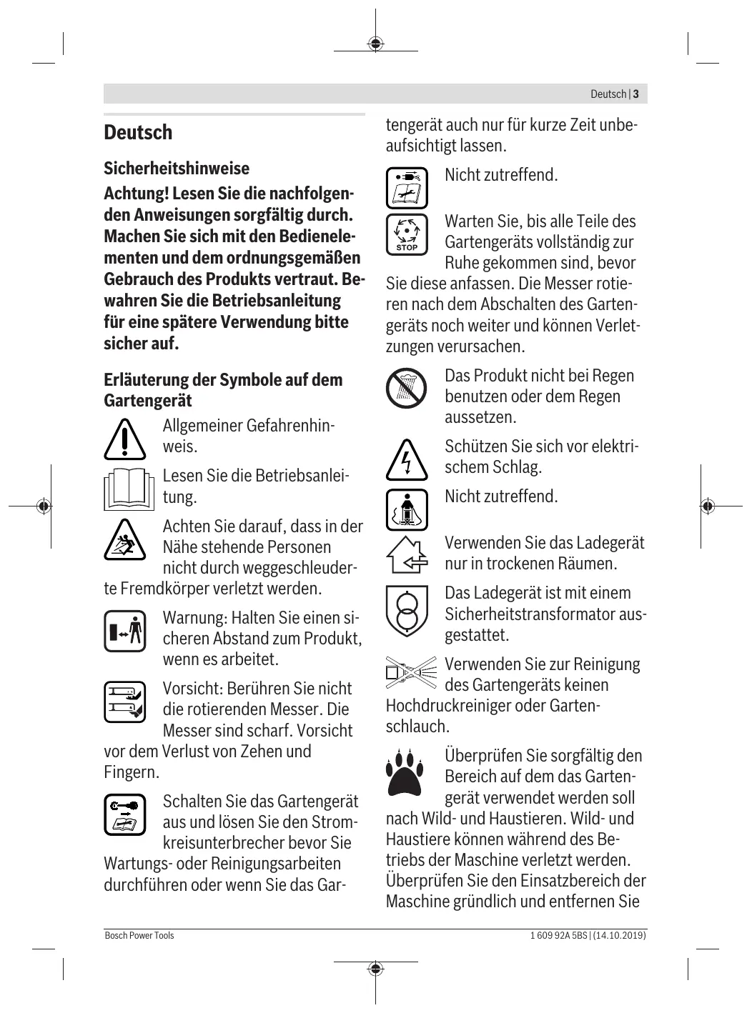 Bosch Power Tools Deutsch | 3 Deutsch Sicherheitshinweise Achtung! Lesen Sie die nachfolgenden Anweisungen sorgfältig durch. Machen Sie sich mit den Bedienelementen und dem ordnungsgemäßen Gebrauch des Produkts vertraut. Bewahren Sie die Betriebsanleitung für eine spätere Verwendung bitte sicher auf. Erläuterung der Symbole auf dem Gartengerät Allgemeiner Gefahrenhinweis. Lesen Sie die Betriebsanleitung. Achten Sie darauf, dass in der Nähe stehende Personen nicht durch weggeschleuderte Fremdkörper verletzt werden. Warnung: Halten Sie einen sicheren Abstand zum Produkt, wenn es arbeitet. Vorsicht: Berühren Sie nicht die rotierenden Messer. Die Messer sind scharf. Vorsicht vor dem Verlust von Zehen und Fingern. Schalten Sie das Gartengerät aus und lösen Sie den Stromkreisunterbrecher bevor Sie Wartungs- oder Reinigungsarbeiten durchführen oder wenn Sie das GarBosch Power Tools tengerät auch nur für kurze Zeit unbeaufsichtigt lassen. Nicht zutreffend. Warten Sie, bis alle Teile des Gartengeräts vollständig zur Ruhe gekommen sind, bevor Sie diese anfassen. Die Messer rotieren nach dem Abschalten des Gartengeräts noch weiter und können Verletzungen verursachen. Das Produkt nicht bei Regen benutzen oder dem Regen aussetzen. Schützen Sie sich vor elektrischem Schlag. Nicht zutreffend. Verwenden Sie das Ladegerät nur in trockenen Räumen. Das Ladegerät ist mit einem Sicherheitstransformator ausgestattet. Verwenden Sie zur Reinigung des Gartengeräts keinen Hochdruckreiniger oder Gartenschlauch. Überprüfen Sie sorgfältig den Bereich auf dem das Gartengerät verwendet werden soll nach Wild- und Haustieren. Wild- und Haustiere können während des Betriebs der Maschine verletzt werden. Überprüfen Sie den Einsatzbereich der Maschine gründlich und entfernen Sie 1 609 92A 5BS | (14.10.2019) 4 | Deutsch alle Steine, Stöcke, Drähte, Knochen und fremde Gegenstände. Achten Sie beim Einsatz der Maschine darauf, dass keine Wildtiere, Haustiere oder kleine Baumstümpfe im dichten Gras versteckt sind. Bedienung u Niemals Kindern oder mit diesen Anweisungen nicht vertrauten Personen erlauben das Produkt zu benutzen. Nationale Vorschriften beschränken möglicherweise das Alter des Bedieners. Bewahren Sie das Produkt für Kinder unerreichbar auf, wenn es nicht in Gebrauch ist. u Erlauben Sie Kindern, Personen mit eingeschränkten physischen, sensorischen oder geistigen Fähigkeiten oder mangelnder Erfahrung und/ oder mangelndem Wissen und/oder mit diesen Anweisungen nicht vertrauten Personen niemals, das Produkt zu benutzen. Nationale Vorschriften beschränken möglicherweise das Alter des Bedieners. u Kinder sollten beaufsichtigt werden, um sicherzustellen, dass sie nicht mit dem Produkt spielen. u Benutzen Sie das Gartengerät niemals während sich Personen, insbesondere Kinder oder Haustiere, in unmittelbarer Nähe aufhalten. u Der Bediener ist für Unfälle oder Schäden an anderen Menschen oder deren Eigentum verantwortlich. u Benutzen Sie keine offenen Gummischuhe oder Sandalen, wenn Sie das 1 609 92A 5BS | (14.10.2019) Produkt benutzen. Tragen Sie stets festes Schuhwerk und eine lange Hose. u Inspizieren Sie die zu bearbeitende Fläche sorgfältig und beseitigen Sie Steine, Stöcke, Drähte, Knochen und sonstige Fremdkörper. u Prüfen Sie vor der Benutzung immer, ob Messer, Messerschrauben und Schneidbaugruppe abgenutzt oder beschädigt sind. Tauschen Sie abgenutzte oder beschädigte Messer sowie Messerschrauben immer im ganzen Satz aus, um Unwucht zu vermeiden. u Mähen Sie nur bei Tageslicht oder gutem künstlichem Licht. u Bei schlechten Wetterbedingungen insbesondere bei einem aufziehendem Gewitter nicht mit dem Rasenmäher arbeiten. u Betreiben Sie das Gartengerät nach Möglichkeit nicht bei nassem Gras. u Stets ruhig gehen, niemals schnell laufen. u Betreiben Sie das Gartengerät niemals mit defekten Schutzvorrichtungen, Abdeckungen oder ohne Sicherheitseinrichtungen, wie z. B. Prallschutz und/oder Grasfangkorb. u Wir empfehlen, einen Gehörschutz zu Ihrem eigenen Schutz zu tragen. u Benutzen Sie das Produkt nicht, wenn Sie müde oder krank sind oder unter dem Einfluss von Alkohol, Drogen oder Medikamenten stehen. Bosch Power Tools Deutsch | 5 Das Arbeiten an Böschungen kann gefährlich sein: − Mähen Sie keine besonders steilen Abhänge. − Achten Sie auf schrägen Flächen oder auf nassem Gras stets auf sicheren Tritt. − Mähen Sie auf schrägen Flächen immer quer und niemals auf- und abwärts. − Gehen Sie beim Richtungswechsel an Abhängen äußerst vorsichtig vor. u Gehen Sie beim Rückwärtsgehen oder Ziehen des Gartengeräts äußerst vorsichtig vor. u Schieben Sie das Gartengerät beim Mähen immer vorwärts und ziehen Sie dieses niemals zum Körper hin. u Die Messer müssen stehen, wenn Sie das Gartengerät für den Transport kippen müssen, wenn Sie nicht mit Gras bepflanzte Flächen überqueren und wenn Sie das Gartengerät zu und von dem zu mähenden Bereich transportieren. u Kippen Sie das Gartengerät beim Starten oder Anlassen des Motors nicht. u Schalten Sie das Gartengerät wie in der Betriebsanleitung beschrieben ein und achten Sie darauf, dass Ihre Füße ausreichend weit von rotierenden Teilen entfernt sind. u Bringen Sie Ihre Hände und Füße nicht in die Nähe oder unter rotierende Teile.
