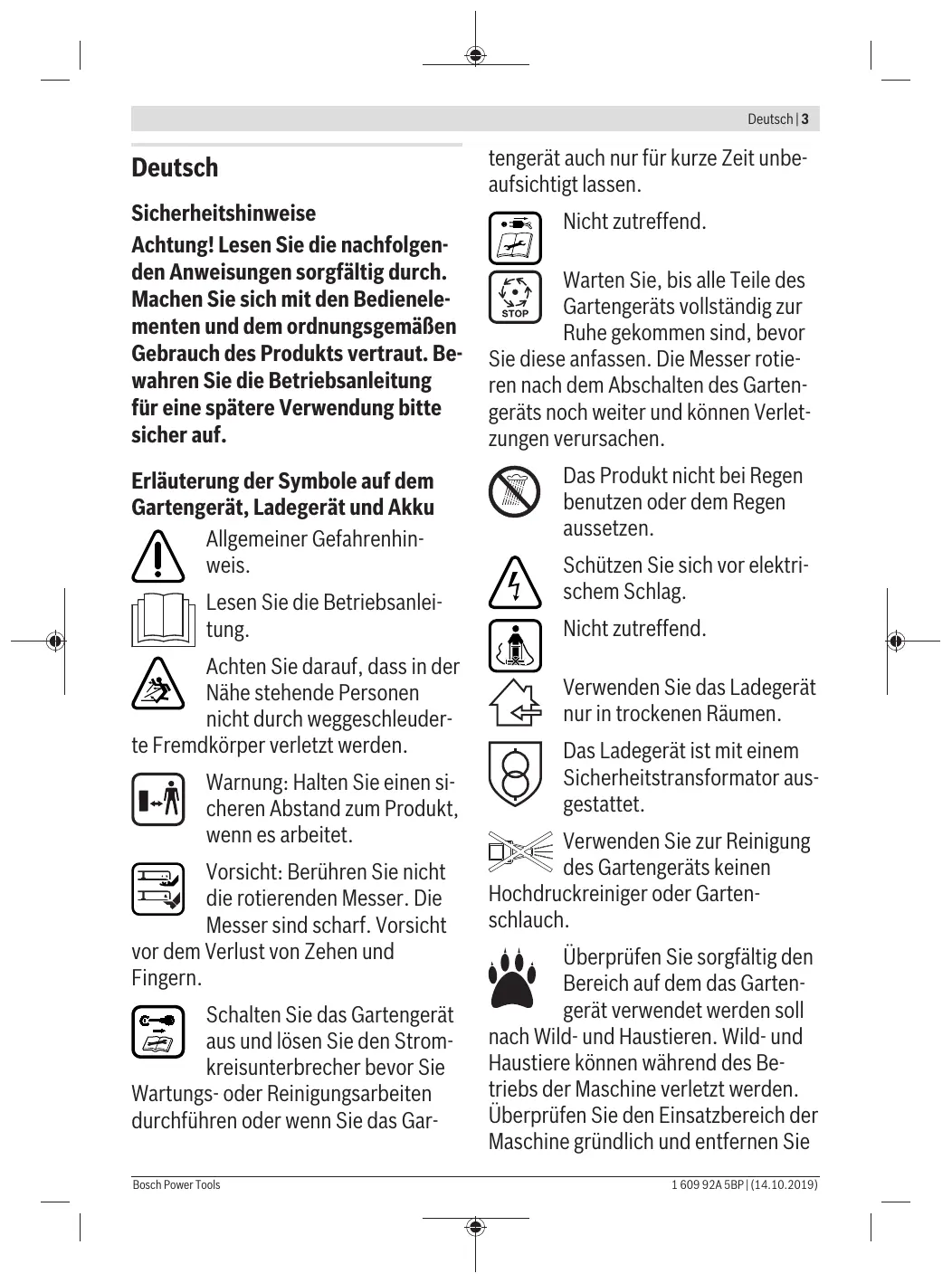 tengerät auch nur für kurze Zeit unbeaufsichtigt lassen. Nicht zutreffend. Warten Sie, bis alle Teile des Gartengeräts vollständig zur Ruhe gekommen sind, bevor Sie diese anfassen. Die Messer rotieren nach dem Abschalten des Gartengeräts noch weiter und können Verletzungen verursachen. Das Produkt nicht bei Regen benutzen oder dem Regen aussetzen. Schützen Sie sich vor elektrischem Schlag. Nicht zutreffend. Verwenden Sie das Ladegerät nur in trockenen Räumen. Das Ladegerät ist mit einem Sicherheitstransformator ausgestattet. Verwenden Sie zur Reinigung des Gartengeräts keinen Hochdruckreiniger oder Gartenschlauch. Überprüfen Sie sorgfältig den Bereich auf dem das Gartengerät verwendet werden soll nach Wild- und Haustieren. Wild- und Haustiere können während des Betriebs der Maschine verletzt werden. Überprüfen Sie den Einsatzbereich der Maschine gründlich und entfernen Sie 1 609 92A 5BP | (14.10.2019)
