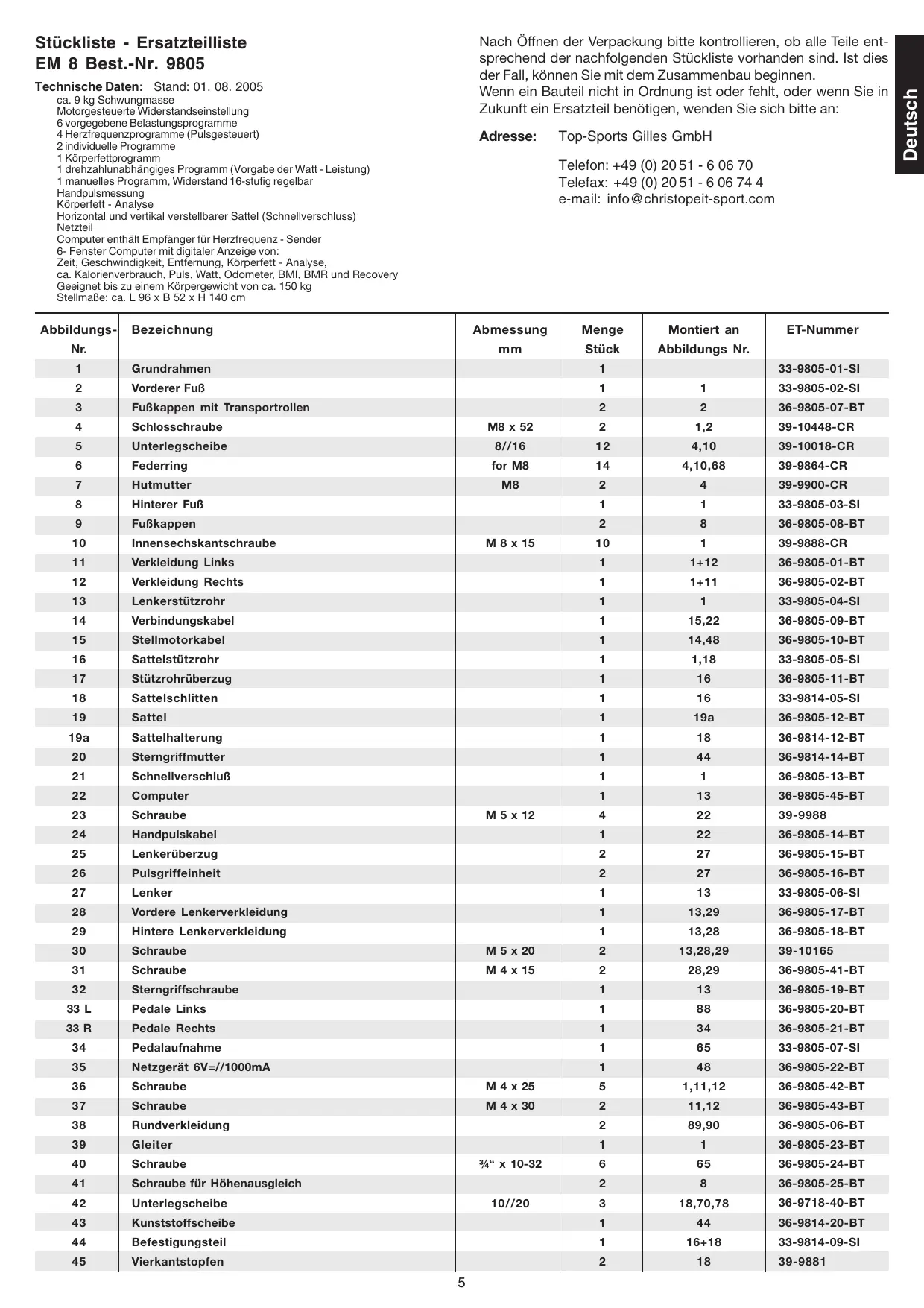 Zeit, Geschwindigkeit, Entfernung, Körperfett - Analyse, ca. Kalorienverbrauch, Puls, Watt, Odometer, BMI, BMR und Recovery Geeignet bis zu einem Körpergewicht von ca. 150 kg Stellmaße: ca. L 96 x B 52 x H 140 cm Abbildungs- Adresse: Top-Sports Gilles GmbH Telefon: +49 (0) 20 51 - 6 06 70 Telefax: +49 (0) 20 51 - 6 06 74 4 e-mail: info@christopeit-sport.com Bezeichnung Nr. Abmessung Menge Montiert an
