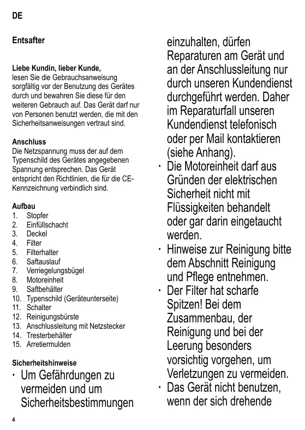 Assurez-vous que la tension d’alimentation correspond à la tension indiquée sur la plaque signalétique de l’appareil. Ce produit est conforme à toutes les directives relatives au marquage “CE”. Familiarisez-vous avec votre appareil 1. Pilon 2. Cheminée d’insertion des aliments 3. Couvercle 13. Cordon d’alimentation avec fiche 14. Collecteur de pulpe 15. Renfoncements de verrouillage
