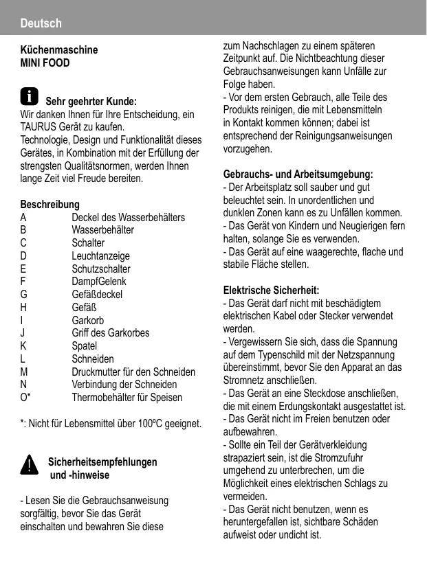 BEDIENUNGSANLEITUNG ROBOT DE CUISINE A VAPEUR 925004 TAURUS