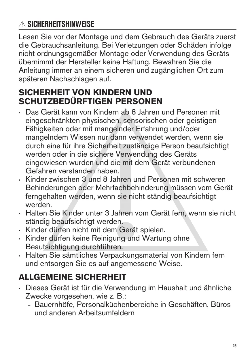 Das Gerät kann von Kindern ab 8 Jahren und Personen mit eingeschränkten physischen, sensorischen oder geistigen Fähigkeiten oder mit mangelnder Erfahrung und/oder mangelndem Wissen nur dann verwendet werden, wenn sie durch eine für ihre Sicherheit zuständige Person beaufsichtigt werden oder in die sichere Verwendung des Geräts eingewiesen wurden und die mit dem Gerät verbundenen Gefahren verstanden haben. Kinder zwischen 3 und 8 Jahren und Personen mit schweren Behinderungen oder Mehrfachbehinderung müssen vom Gerät ferngehalten werden, wenn sie nicht ständig beaufsichtigt werden. Halten Sie Kinder unter 3 Jahren vom Gerät fern, wenn sie nicht ständig beaufsichtigt werden. Kinder dürfen nicht mit dem Gerät spielen. Kinder dürfen keine Reinigung und Wartung ohne Beaufsichtigung durchführen. Halten Sie sämtliches Verpackungsmaterial von Kindern fern und entsorgen Sie es auf angemessene Weise.