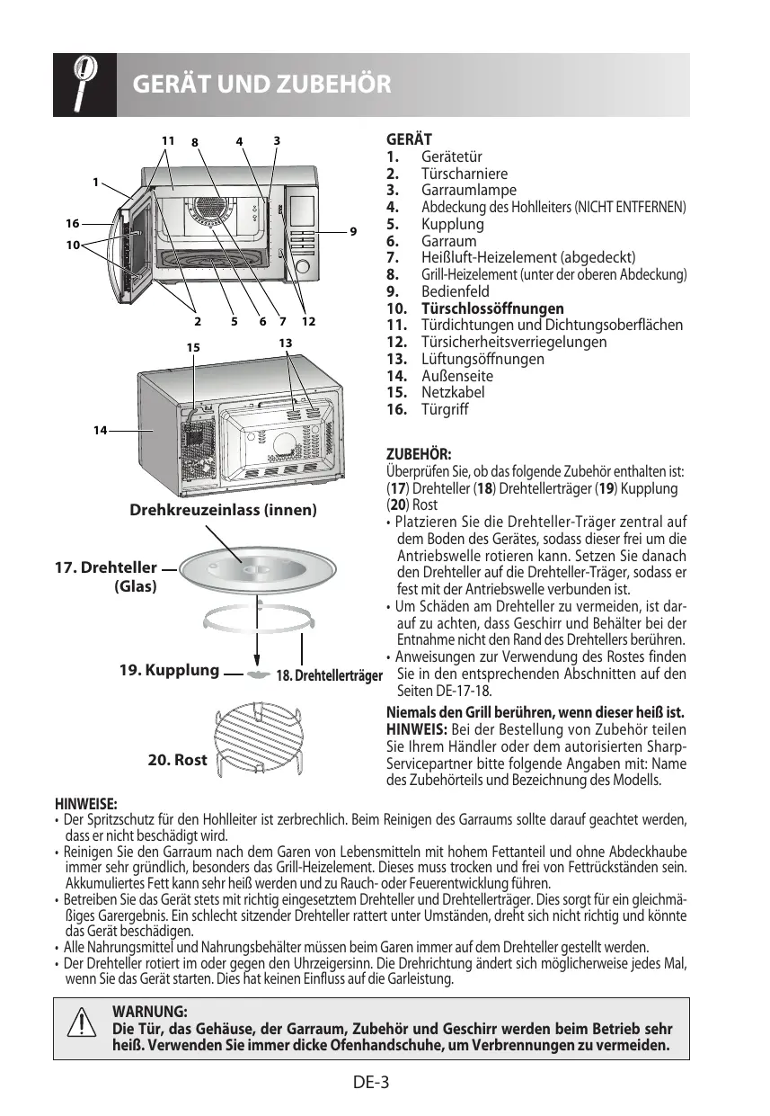 (verre) qu'il soit positionné fermement dans l'entraînement. • Pour éviter d’endommager le plateau tournant, assurez-vous que les plats ou les récipients ne touchent 18. Support pas le bord du plateau lorsqu’ils sont retirés du four. 19. Entraînement du plateau • Pour l'utilisation de la grille, référez-vous aux sections gril des pages F-17-18. tournant Ne touchez jamais la grille lorsqu'elle est chaude. REMARQUE : Lorsque vous passez une commande d’ accessoires, veuillez mentionner au revendeur ou au 20. Grille service d’entretien agréé par SHARP le nom des pièces et du modèle. REMARQUES : • Le boîtier du guide d'ondes est fragile. Veuillez faire très attention en nettoyant l’intérieur du four à ne pas l’ endommager. • Après la cuisson d'aliments gras sans couvercle, nettoyez toujours la cavité et particulièrement l'élément gril de manière approfondie, ceux-ci devant être secs et exempts de graisse. La graisse accumulée peut chauffer et commencer à fumer voir s'enflammer. • Faites toujours fonctionner le four avec le plateau tournant et les pieds du plateau correctement installés. Ceci favorise une cuisson régulière. Un plateau mal installé peut entraîner une mauvaise rotation et endommager le four. • Tous les aliments et les récipients contenant de la nourriture doivent être placés sur le plateau tournant durant la cuisson. • Le plateau tournant pivote dans le sens des aiguilles d’une montre ou dans le sens inverse. Le sens de la rotation peut changer à chaque utilisation du four. Ceci n’affecte pas les performances de cuisson. AVERTISSEMENT : La porte, le boîtier extérieur, la cavité du four et les accessoires peuvent devenir très chauds durant le fonctionnement. Pour éviter de vous brûler, utilisez toujours d'épais gants de cuisine anti-chaleur pour four.