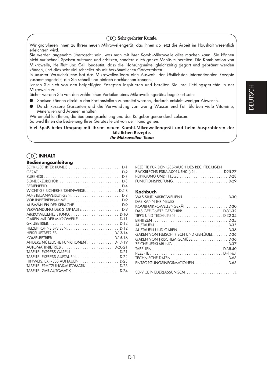 Diese Bedienungsanleitung enthält wichtige Informationen, welche Sie vor Inbetriebnahme des Gerätes unbedingt sorgfältig durchlesen sollten. Achtung: Die Nichtbeachtung der Gebrauchs- und Serviceanweisungen sowie jeglicher Eingriff, der das Betreiben des Gerätes in geöffnetem Zustand (z.B. geöffnetes Gehäuse) erlaubt, führt zu erheblichen Gesundheitsschäden. Ce mode d’emploi du four contient des informations importantes, que vous devez lire avant d’utiliser votre four à micro–ondes. Avertissement: Des risques sérieux pour la santé peuvent être encourus si ces instructions d’utilisation et d’entretien ne sont pas respectées ou si le four est modifié de sorte qu’il soit possible de le faire fonctionner lorsque la porte est ouverte. Deze gebruiksaanwijzing bevat belangrijke informatie die u dient te lezen alvorens u de oven in gebruik neemt. Waarschuwing: Het niet naleven van de gebruiks- en onder- houdsvoorschriften evenals elke ingreep die het mogelijk maakt dat het toestel in niet-gesloten toestand in werking kan gesteld worden, kan leiden tot ernstige gezondheidsletsels. 1050 W (IEC 60705) FRANÇAIS Waarschuwing DEUTSCH REHEAT NEDERLANDS COOK Viel Spaß beim Umgang mit Ihrem neuen Kombi-Mikrowellengerät und beim Ausprobieren der köstlichen Rezepte. Ihr Mikrowellen-Team INHALT Bedienungsanleitung SEHR GEEHRTER KUNDE . . . . . . . . GERÄT . . . . . . . . . . . . . . . . . . . . . ZUBEHÖR . . . . . . . . . . . . . . . . . . . SONDERZUBEHÖR . . . . . . . . . . . . BEDIENFELD . . . . . . . . . . . . . . . . . WICHTIGE SICHERHEITSHINWEISE. AUFSTELLANWEISUNGEN . . . . . . . VOR INBETRIEBNAHME . . . . . . . . . AUSWÄHLEN DER SPRACHE . . . . . VERWENDUNG DER STOP-TASTE . . MIKROWELLENLEISTUNG. . . . . . . . GAREN MIT DER MIKROWELLE. . . . GRILLBETRIEB. . . . . . . . . . . . . . . . . HEIZEN OHNE SPEISEN. . . . . . . . . HEISSLUFTBETRIEB . . . . . . . . . . . . . KOMBI-BETRIEB . . . . . . . . . . . . . . .