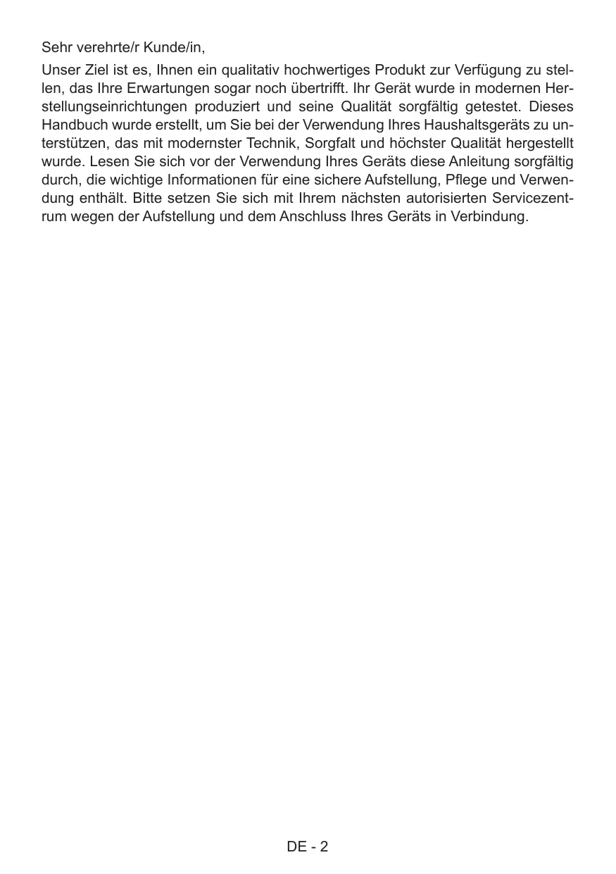 TRANSPORT Si vous avez besoin de transporter l’appareil : Gardez l’emballage original du produit et transportez-le dans son emballage original si nécessaire. Suivez les ins- FR - 17 tructions de transport sur l’emballage. Scotchez les pièces supérieures, couvercles et porte-casseroles du four sur les panneaux de cuisson. Placez un papier entre le panneau supérieur et le panneau de cuisson, couvrez le couvercle supérieur puis scotchez aux surfaces latérales du four. Scotchez du carton ou du papier sur la partie vitrée intérieure du panneau avant, les plaques et grilles de votre four pouvant endommager le panneau du four durant le transport. Scotchez aussi les panneaux du four aux parois latérales. Si vous ne disposez de l’emballage original : Mesurez les surfaces externes (surfaces vitrées et peintes) du four contre les chocs possibles. FR - 18 Sehr verehrte/r Kunde/in, Unser Ziel ist es, Ihnen ein qualitativ hochwertiges Produkt zur Verfügung zu stellen, das Ihre Erwartungen sogar noch übertrifft. Ihr Gerät wurde in modernen Herstellungseinrichtungen produziert und seine Qualität sorgfältig getestet. Dieses Handbuch wurde erstellt, um Sie bei der Verwendung Ihres Haushaltsgeräts zu unterstützen, das mit modernster Technik, Sorgfalt und höchster Qualität hergestellt wurde. Lesen Sie sich vor der Verwendung Ihres Geräts diese Anleitung sorgfältig durch, die wichtige Informationen für eine sichere Aufstellung, Pflege und Verwendung enthält. Bitte setzen Sie sich mit Ihrem nächsten autorisierten Servicezentrum wegen der Aufstellung und dem Anschluss Ihres Geräts in Verbindung. DE - 2 Inhalt Vorstellung und Abmessungen des Produkts Warnhinweise Vorbereitung des Einbaus und der Verwendung Den Herd verwenden Reinigung und Wartung Ihres Produkts Reparatur und Transport DE - 3