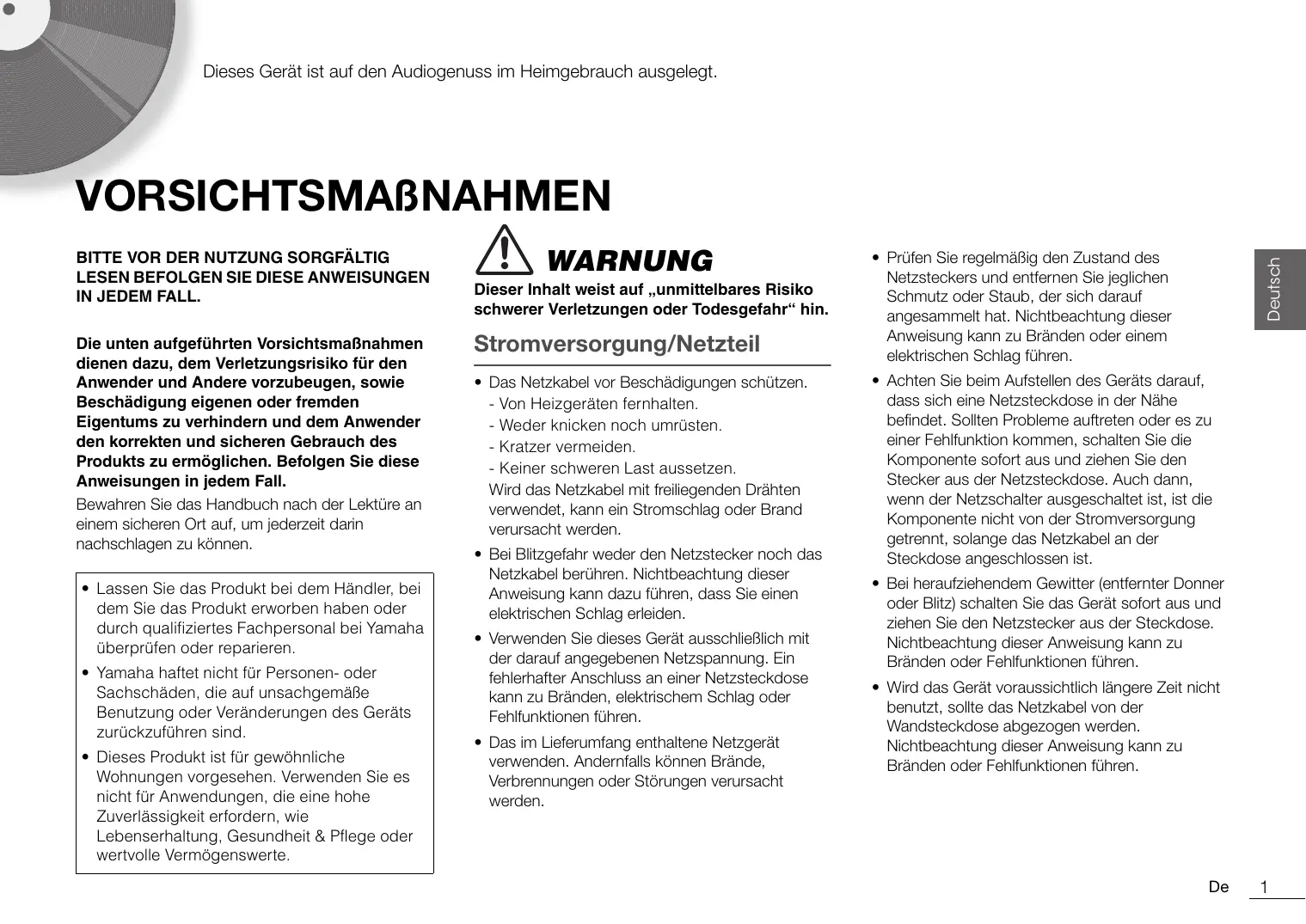 Laden Sie die Anleitung für Ihr Plattenspieler kostenlos im PDF-Format! Finden Sie Ihr Handbuch MUSICCAST VINYL 500 - YAMAHA und nehmen Sie Ihr elektronisches Gerät wieder in die Hand. Auf dieser Seite sind alle Dokumente veröffentlicht, die für die Verwendung Ihres Geräts notwendig sind. MUSICCAST VINYL 500 von der Marke YAMAHA.