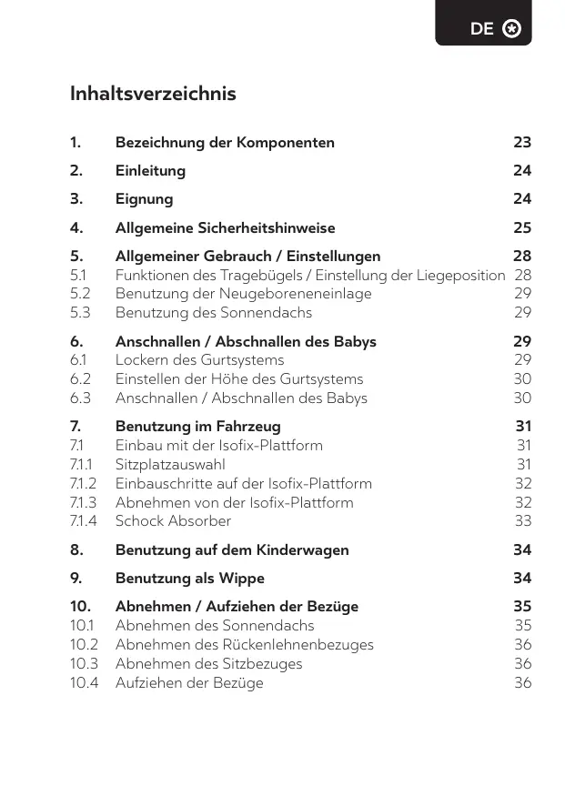 73 73 Housse de siège Dispositif de réglage central Boucle Amortisseur de chocs Poignée de déverrouillage de la coque bébé Barre de verrouillage Pare-soleil Insert pour nouveau-né Languettes de verrouillage de la ceinture de sécurité Bouton de la poignée de transport Couvercle frontal Bouton de déverrouillage du pare-soleil Joint du pare-soleil Poignée de réglage de la hauteur