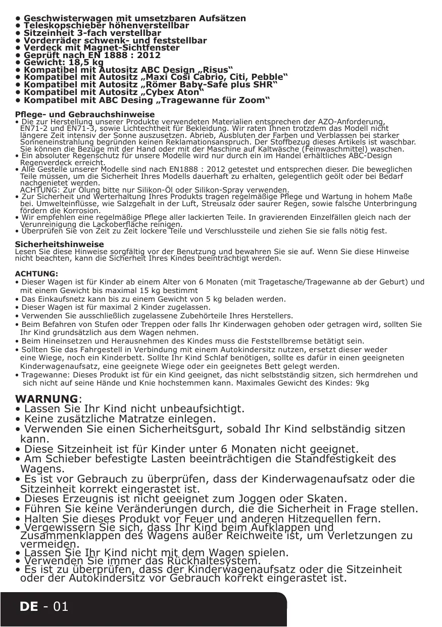 Geschwisterwagen mit umsetzbaren Aufsätzen Teleskopschieber höhenverstellbar Sitzeinheit 3-fach verstellbar Vorderräder schwenk- und feststellbar Verdeck mit Magnet-Sichtfenster Geprüft nach EN 1888 : 2012 Gewicht: 18,5 kg Kompatibel mit Autositz ABC Design „Risus“ Kompatibel mit Autositz „Maxi Cosi Cabrio, Citi, Pebble“ Kompatibel mit Autositz „Römer Baby-Safe plus SHR“ Kompatibel mit Autositz „Cybex Aton“ Kompatibel mit ABC Desing „Tragewanne für Zoom“ Pflege- und Gebrauchshinweise