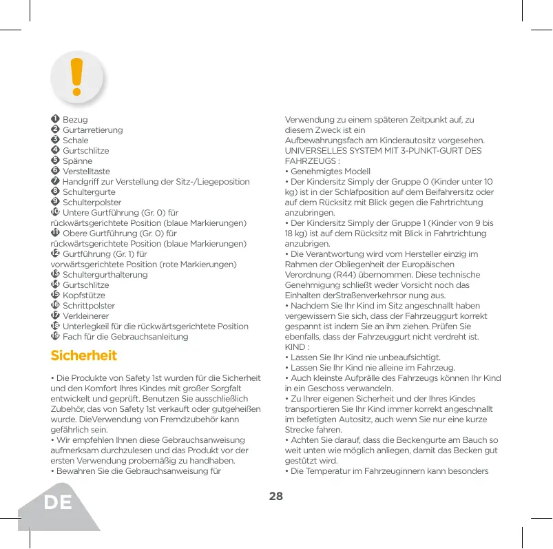 - Die Produkte von Safety 1st wurden für die Sicherheit und den Komfort Ihres Kindes mit großer Sorgfalt entwickelt und geprüft. Benutzen Sie ausschließlich Zubehör, das von Safety 1st verkauft oder gutgeheißen wurde. DieVerwendung von Fremdzubehör kann gefährlich sein.