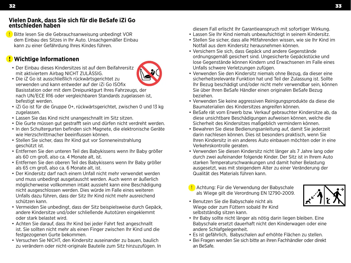 diesem Fall erlischt Ihr Garantieanspruch mit sofortiger Wirkung. • Lassen Sie Ihr Kind niemals unbeaufsichtigt in seinem Kindersitz. • Stellen Sie sicher, dass alle Mitfahrenden wissen, wie sie Ihr Kind im Notfall aus dem Kindersitz herausnehmen können. • Versichern Sie sich, dass Gepäck und andere Gegenstände ordnungsgemäß gesichert sind. Ungesicherte Gepäckstücke und lose Gegenstände können Kindern und Erwachsenen im Falle eines Unfalls schwere Verletzungen zufügen. • Verwenden Sie den Kindersitz niemals ohne Bezug, da dieser eine sicherheitsrelevante Funktion hat und Teil der Zulassung ist. Sollte Ihr Bezug beschädigt und/oder nicht mehr verwendbar sein, können Sie über Ihren BeSafe Händler einen originalen BeSafe Bezug beziehen. • Verwenden Sie keine aggressiven Reinigungsprodukte da diese die Baumaterialien des Kindersitzes angreifen können. • BeSafe rät vom Erwerb bzw. Verkauf gebrauchter Kindersitze ab, da diese unsichtbare Beschädigungen aufweisen können, welche die Sicherheit des Kindersitzes maßgeblich vermindern können. • Bewahren Sie diese Bedienungsanleitung auf, damit Sie jederzeit darin nachlesen können. Dies ist besonders praktisch, wenn Sie Ihren Kindersitz in ein anderes Auto einbauen möchten oder in eine Verkehrskontrolle geraten. • Verwenden Sie diesen Kindersitz nicht länger als 7 Jahre lang oder durch zwei aufeinander folgende Kinder. Der Sitz ist in Ihrem Auto starken Temperaturschwankungen und damit hoher Belastung ausgesetzt, was mit steigendem Alter zu einer Veränderung der Qualität des Materials führen kann. !! Achtung: Für die Verwendung der Babyschale als Wiege gilt die Verordnung EN 12790-2009. • Benutzen Sie die Babyschale nicht als Wiege oder zum Füttern sobald Ihr Kind selbstständig sitzen kann. • Ihr Baby sollte nicht länger als nötig darin liegen bleiben. Eine Babyschale ersetzt dauerhaft nicht den Kinderwagen oder eine andere Schlafgelegenheit. • Es ist gefährlich, Babyschalen auf erhöhte Flächen zu stellen. • Bei Fragen wenden Sie sich bitte an ihren Fachhändler oder direkt an BeSafe.