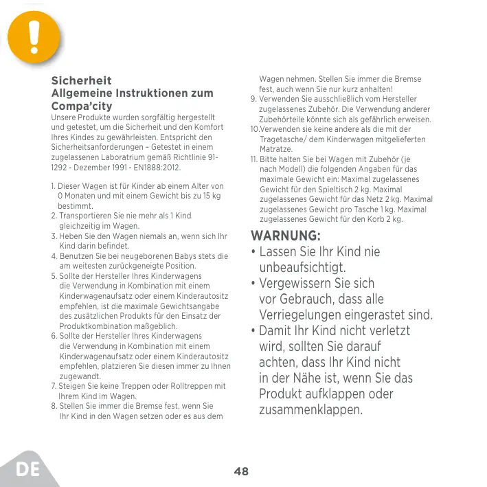 Sicherheit Allgemeine Instruktionen zum Compa’city Wagen nehmen. Stellen Sie immer die Bremse fest, auch wenn Sie nur kurz anhalten!
