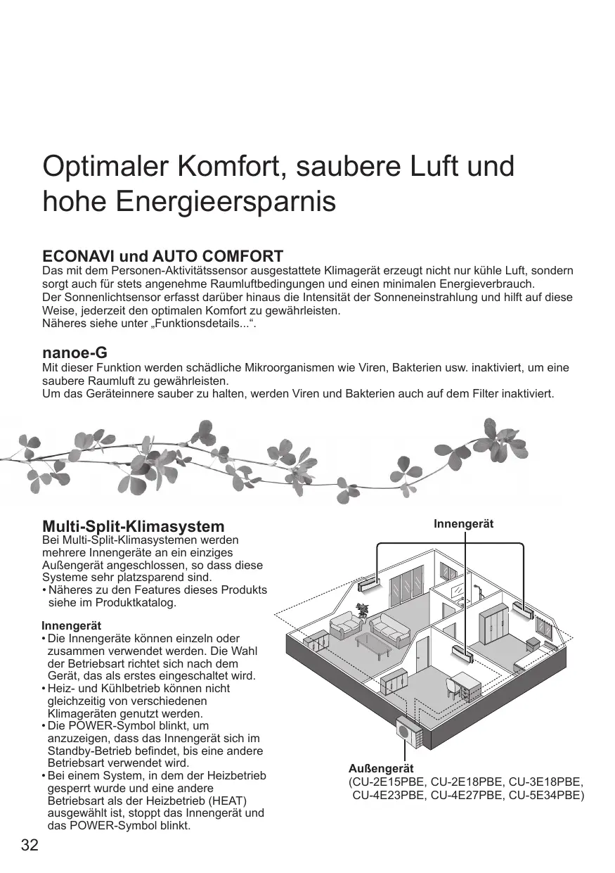 Optimaler Komfort, saubere Luft und hohe Energieersparnis ECONAVI und AUTO COMFORT Das mit dem Personen-Aktivitätssensor ausgestattete Klimagerät erzeugt nicht nur kühle Luft, sondern sorgt auch für stets angenehme Raumluftbedingungen und einen minimalen Energieverbrauch. Der Sonnenlichtsensor erfasst darüber hinaus die Intensität der Sonneneinstrahlung und hilft auf diese Weise, jederzeit den optimalen Komfort zu gewährleisten. Näheres siehe unter „Funktionsdetails...“. nanoe-G Mit dieser Funktion werden schädliche Mikroorganismen wie Viren, Bakterien usw. inaktiviert, um eine saubere Raumluft zu gewährleisten. Um das Geräteinnere sauber zu halten, werden Viren und Bakterien auch auf dem Filter inaktiviert. Multi-Split-Klimasystem Innengerät Bei Multi-Split-Klimasystemen werden mehrere Innengeräte an ein einziges Außengerät angeschlossen, so dass diese Systeme sehr platzsparend sind.