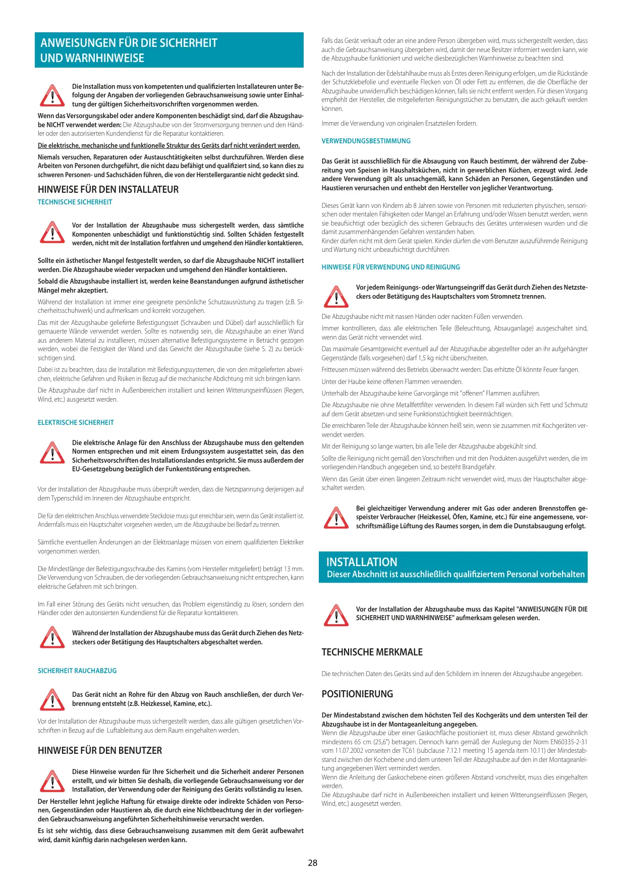 Diese Hinweise wurden für Ihre Sicherheit und die Sicherheit anderer Personen erstellt, und wir bitten Sie deshalb, die vorliegende Gebrauchsanweisung vor der Installation, der Verwendung oder der Reinigung des Geräts vollständig zu lesen. Der Hersteller lehnt jegliche Haftung für etwaige direkte oder indirekte Schäden von Personen, Gegenständen oder Haustieren ab, die durch eine Nichtbeachtung der in der vorliegenden Gebrauchsanweisung angeführten Sicherheitshinweise verursacht werden. Es ist sehr wichtig, dass diese Gebrauchsanweisung zusammen mit dem Gerät aufbewahrt wird, damit künftig darin nachgelesen werden kann.