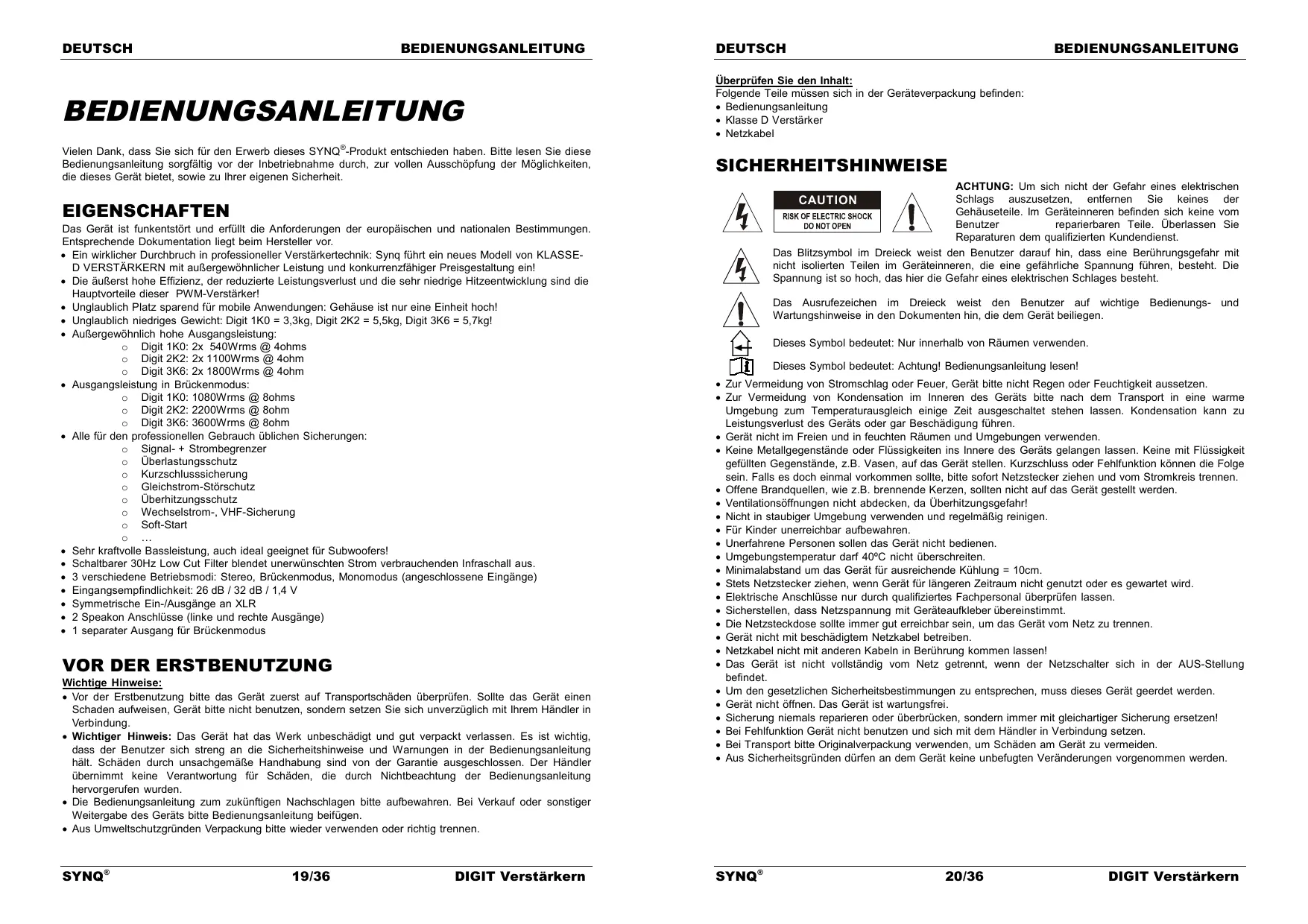 Wichtige Hinweise: Vor der Erstbenutzung bitte das Gerät zuerst auf Transportschäden überprüfen. Sollte das Gerät einen Schaden aufweisen, Gerät bitte nicht benutzen, sondern setzen Sie sich unverzüglich mit Ihrem Händler in Verbindung. Wichtiger Hinweis: Das Gerät hat das Werk unbeschädigt und gut verpackt verlassen. Es ist wichtig, dass der Benutzer sich streng an die Sicherheitshinweise und Warnungen in der Bedienungsanleitung hält. Schäden durch unsachgemäße Handhabung sind von der Garantie ausgeschlossen. Der Händler übernimmt keine Verantwortung für Schäden, die durch Nichtbeachtung der Bedienungsanleitung hervorgerufen wurden. Die Bedienungsanleitung zum zukünftigen Nachschlagen bitte aufbewahren. Bei Verkauf oder sonstiger Weitergabe des Geräts bitte Bedienungsanleitung beifügen. Aus Umweltschutzgründen Verpackung bitte wieder verwenden oder richtig trennen. SYNQ® 19/36 DIGIT Verstärkern Das Ausrufezeichen im Dreieck weist den Benutzer auf wichtige Bedienungs- und Wartungshinweise in den Dokumenten hin, die dem Gerät beiliegen. Dieses Symbol bedeutet: Nur innerhalb von Räumen verwenden. Dieses Symbol bedeutet: Achtung! Bedienungsanleitung lesen! Zur Vermeidung von Stromschlag oder Feuer, Gerät bitte nicht Regen oder Feuchtigkeit aussetzen. Zur Vermeidung von Kondensation im Inneren des Geräts bitte nach dem Transport in eine warme Umgebung zum Temperaturausgleich einige Zeit ausgeschaltet stehen lassen. Kondensation kann zu Leistungsverlust des Geräts oder gar Beschädigung führen. Gerät nicht im Freien und in feuchten Räumen und Umgebungen verwenden. Keine Metallgegenstände oder Flüssigkeiten ins Innere des Geräts gelangen lassen. Keine mit Flüssigkeit gefüllten Gegenstände, z.B. Vasen, auf das Gerät stellen. Kurzschluss oder Fehlfunktion können die Folge sein. Falls es doch einmal vorkommen sollte, bitte sofort Netzstecker ziehen und vom Stromkreis trennen. Offene Brandquellen, wie z.B. brennende Kerzen, sollten nicht auf das Gerät gestellt werden. Ventilationsöffnungen nicht abdecken, da Überhitzungsgefahr! Nicht in staubiger Umgebung verwenden und regelmäßig reinigen. Für Kinder unerreichbar aufbewahren. Unerfahrene Personen sollen das Gerät nicht bedienen. Umgebungstemperatur darf 40ºC nicht überschreiten. Minimalabstand um das Gerät für ausreichende Kühlung = 10cm. Stets Netzstecker ziehen, wenn Gerät für längeren Zeitraum nicht genutzt oder es gewartet wird. Elektrische Anschlüsse nur durch qualifiziertes Fachpersonal überprüfen lassen. Sicherstellen, dass Netzspannung mit Geräteaufkleber übereinstimmt. Die Netzsteckdose sollte immer gut erreichbar sein, um das Gerät vom Netz zu trennen. Gerät nicht mit beschädigtem Netzkabel betreiben. Netzkabel nicht mit anderen Kabeln in Berührung kommen lassen! Das Gerät ist nicht vollständig vom Netz getrennt, wenn der Netzschalter sich in der AUS-Stellung befindet. Um den gesetzlichen Sicherheitsbestimmungen zu entsprechen, muss dieses Gerät geerdet werden. Gerät nicht öffnen. Das Gerät ist wartungsfrei. Sicherung niemals reparieren oder überbrücken, sondern immer mit gleichartiger Sicherung ersetzen! Bei Fehlfunktion Gerät nicht benutzen und sich mit dem Händler in Verbindung setzen. Bei Transport bitte Originalverpackung verwenden, um Schäden am Gerät zu vermeiden. Aus Sicherheitsgründen dürfen an dem Gerät keine unbefugten Veränderungen vorgenommen werden. SYNQ® 20/36 DIGIT Verstärkern DEUTSCH BEDIENUNGSANLEITUNG INSTALLATIONSANLEITUNG: Stellen Sie das Gerät in einem gut belüfteten Raum auf, wo es nicht Feuchtigkeit und hohen Temperaturen ausgesetzt wird. Plazieren und benutzen Sie das Gerät für eine längere Zeit neben sehr warmen Geräten wie Verstärker, Lampen, etc., könnte es die Funktion des Geräts beeinträchtigen. Das Gerät kann in 19“ Racks eingebaut werden. Benutzen Sie dafür die in der Frontblende eingelassenen Löcher. Sollte das Gerät in ein Flightcase eingebaut werden, achten Sie auf eine gute Luftzirkulation. Wenn das Gerät aus einer kalten Umgebung an einem warmen Ort aufgestellt wird, kann sich Kondenswasser bilden. Um Fehlfunktionen zu vermeiden, sollten Sie das Gerät für ca. 1 Stunde vom Stromnetz trennen. WARTUNG Die Reinigung des Geräts erfolgt mit einem leicht mit Wasser angefeuchteten Tuch. Vermeiden Sie, dass Wasser in das Gerätinnere gelangt. Verwenden Sie keine brennbaren Flüssigkeiten wie Benzin oder Verdünner, die das Gerät beschädigen würden. Säubern Sie regelmäßig die Ventilationsöffnungen mit einem Staubsauger. Dies hilft den Ventilatoren im Verstärker die Kühlung aufrechtzuerhalten, damit das Gerät nicht überhitzt. ANSCHLÜSSE Seien Sie sich sicher das Sie dass Gerät abgeschaltet haben, bevor Sie Veränderungen an der Verkabelung vornehmen. Für die Signal Eingänge empfehlen wir die XLR Verbindungen zu verwenden. Um Ihnen gute Audio Qualität zu Gewährleisten verwenden Sie ausschließlich gute Kabel. Für die Lautsprecher empfehlen wir die Speakon® Ausgänge zu verwenden. In der Gerätebeschreibung finden Sie weitere Hinweise zum Anschluss des Verstärkers. FUNKTIONEN (VORDERSEITE) DEUTSCH BEDIENUNGSANLEITUNG