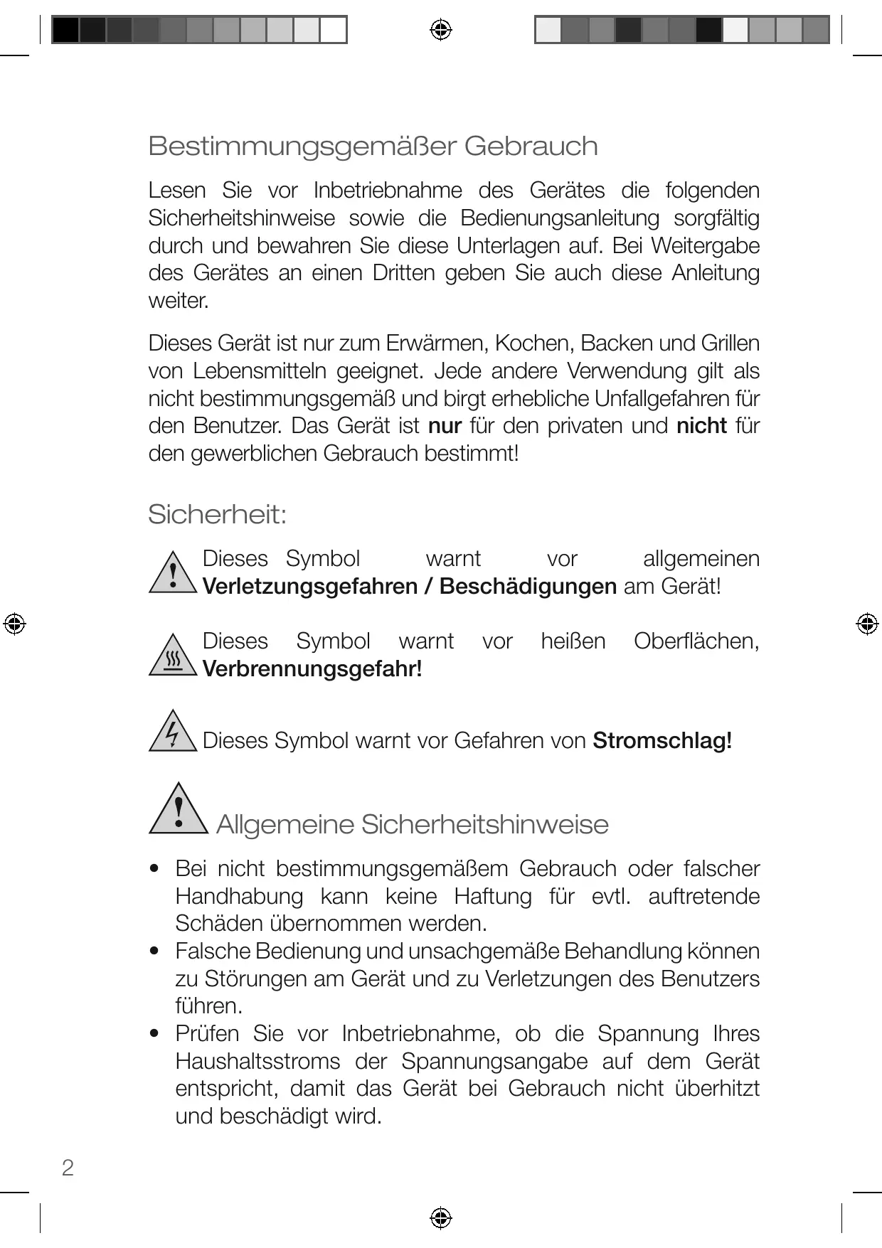 Dieses Gerät ist nur zum Erwärmen, Kochen, Backen und Grillen von Lebensmitteln geeignet. Jede andere Verwendung gilt als nicht bestimmungsgemäß und birgt erhebliche Unfallgefahren fur den Benutzer. Das Gerät ist nur fur den privaten und nicht fur den gewerblichen Gebrauch bestimmt!