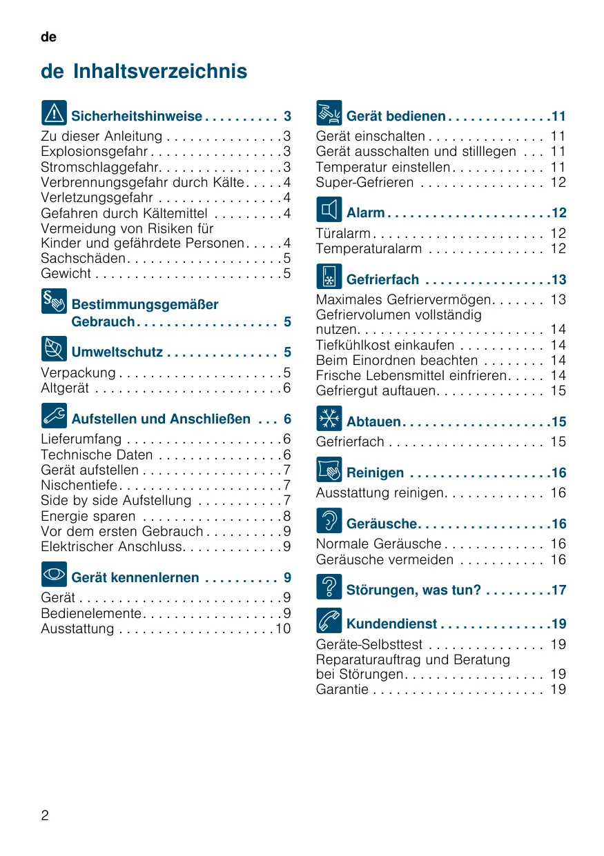 Lieferumfang . . . . . . . . . . . Technische Daten . . . . . . . Gerät aufstellen . . . . . . . . . Nischentiefe . . . . . . . . . . . . Side by side Aufstellung . . Energie sparen . . . . . . . . . Vor dem ersten Gebrauch . Elektrischer Anschluss. . . .