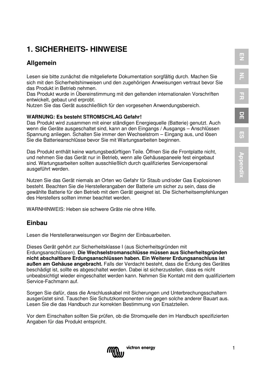 BEDIENUNGSANLEITUNG 24-1600 230V VICTRON ENERGY