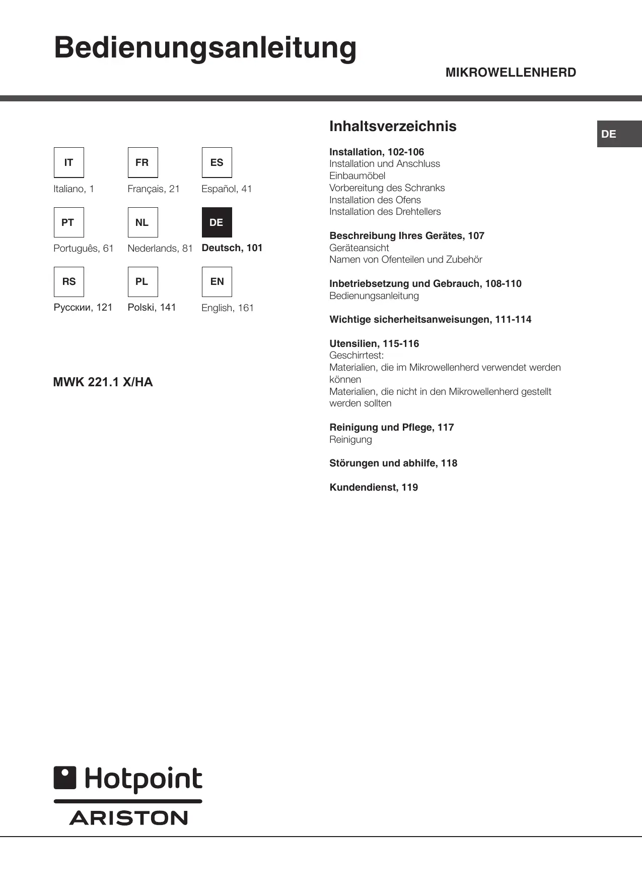 BEDIENUNGSANLEITUNG MWK211KHA HOTPOINT