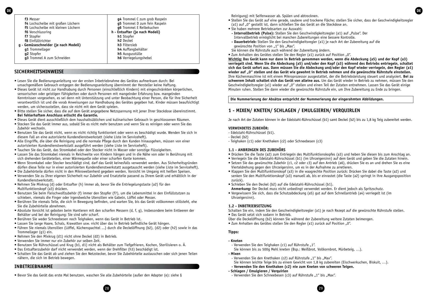 SICHERHEITSHINWEISE • Lesen Sie die Bedienungsanleitung vor der ersten Inbetriebnahme des Gerätes aufmerksam durch: Bei unsachgemäßem Gebrauch entgegen der Bedienungsanleitung übernimmt der Hersteller keine Haftung. • Dieses Gerät ist nicht zur Handhabung durch Personen (einschließlich Kindern) mit eingeschränkten körperlichen, sensorischen oder geistigen Fähigkeiten oder durch Personen mit mangelnder Erfahrung bzw. mangelnden Kenntnissen vorgesehen, es sei denn mit Unterstützung und unter Beobachtung einer Person, die für ihre Sicherheit verantwortlich ist und die vorab Anweisungen zur Handhabung des Gerätes gegeben hat. Kinder müssen beaufsichtigt werden, um sicherzustellen, dass sie nicht mit dem Gerät spielen. • Bitte stellen Sie sicher, dass die auf dem Gerät angegebene Netzspannung mit jener Ihrer Steckdose übereinstimmt. Bei fehlerhaftem Anschluss erlischt die Garantie. • Dieses Gerät dient ausschließlich dem haushaltsüblichen und kulinarischen Gebrauch in geschlossenen Räumen. • Stecken Sie das Gerät immer aus, sobald Sie es nicht mehr benutzen und wenn Sie es reinigen oder wenn Sie das Zubehör wechseln. • Benutzen Sie das Gerät nicht, wenn es nicht richtig funktioniert oder wenn es beschädigt wurde. Wenden Sie sich in diesem Fall an eine autorisierte Kundendienstwerkstatt (siehe Liste im Serviceheft). • Alle Eingriffe, die über die Reinigung und die normale Pflege durch den Kunden hinausgehen, müssen von einer autorisierten Kundendienstwerkstatt ausgeführt werden (siehe Liste im Serviceheft). • Tauchen Sie das Gerät, das Stromkabel oder den Stecker nicht in Wasser oder sonstige Flüssigkeiten. • Lassen Sie das Stromkabel niemals in Reichweite von Kindern hängen und in die Nähe von oder in Berührung mit sich drehenden Geräteteilen, einer Wärmequelle oder einer scharfen Kante kommen. • Wenn Stromkabel oder Stecker beschädigt sind, darf das Gerät keinesfalls verwendet werden. Aus Sicherheitsgründen dürfen diese Teile nur in einer autorisierten Kundendienstwerkstatt ausgetauscht werden (siehe Liste im Serviceheft). • Die Zubehörteile dürfen nicht in den Mikrowellenherd gegeben werden. Vorsicht im Umgang mit heißen Speisen. • Verwenden Sie zu Ihrer eigenen Sicherheit nur Zubehör und Ersatzteile passend zu Ihrem Gerät und erhältlich in der Kundendienstwerkstatt. • Nehmen Sie Mixkrug (d) oder Entsafter (h) immer ab, bevor Sie die Entriegelungstaste (a2) für den Multifunktionskopf (a3) drücken. • Benutzen Sie beim Fleischwolfzubehör (f) immer den Stopfer (f7), um die Lebensmittel in den Einfüllstutzen zu schieben, niemals die Finger oder irgendwelche Utensilien wie Gabeln, Löffel oder Messer. • Berühren Sie niemals Teile, die sich in Bewegung befinden, und warten Sie, bis das Gerät vollkommen stillsteht, ehe Sie die Zubehörteile abnehmen. • Absolute Vorsicht ist geboten beim Hantieren mit den scharfen Messern (d, f, g), insbesondere beim Entleeren der Behälter und bei der Reinigung: Sie sind sehr scharf. • Berühren Sie weder Schneebesen noch Teighaken, wenn das Gerät in Betrieb ist. • Lassen Sie lange Haare, Schals, Krawatten usw. nicht über das in Betrieb befindliche Gerät hängen. • Führen Sie niemals Utensilien (Löffel, Küchenspachtel ...) durch die Deckelöffnung (b2), (d2) oder (h2) sowie in das Trommellager (g1) ein. • Nehmen Sie den Mixkrug (d1) nicht ohne Deckel (d2) in Betrieb. • Verwenden Sie immer nur ein Zubehör zur selben Zeit. • Benutzen Sie Rührschüssel und Krug (b1, d1) nicht als Behälter zum Tiefgefrieren, Kochen, Sterilisieren o. Ä. • Das Entsafterzubehör darf nicht verwendet werden, wenn der Drehfilter (h3) beschädigt ist. • Schalten Sie das Gerät ab und ziehen Sie den Netzstecker, bevor Sie Zubehörteile austauschen oder sich jenen Teilen nähern, die sich im Betrieb bewegen.