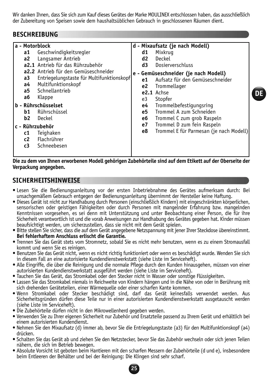 Wir danken Ihnen, dass Sie sich zum Kauf dieses Gerätes der Marke MOULINEX entschlossen haben, das ausschließlich der Zubereitung von Speisen sowie dem haushaltsüblichen Gebrauch in geschlossenen Räumen dient. BESCHREIBUNG a - Motorblock d - Mixaufsatz (je nach Modell) a1 Geschwindigkeitsregler d1 Mixkrug a2 Langsamer Antrieb d2 Deckel a2.1 Antrieb für das Rührzubehör d3 Dosierverschluss a2.2 Antrieb für den Gemüseschneider e - Gemüseschneider (je nach Modell) a3 Entriegelungstaste für Multifunktionskopf e1 Aufsatz für den Gemüseschneider a4 Multifunktionskopf e2 Trommellager a5 Schnellantrieb e2.1 Achse a6 Klappe e3 Stopfer e4 Trommelbefestigungsring b - Rührschüsselset e5 Trommel A zum Schneiden b1 Rührschüssel e6 Trommel C zum grob Raspeln b2 Deckel e7 Trommel D zum fein Raspeln c - Rührzubehör e8 Trommel E für Parmesan (je nach Modell) c1 Teighaken c2 Flachrührer c3 Schneebesen Die zu dem von Ihnen erworbenen Modell gehörigen Zubehörteile sind auf dem Etikett auf der Oberseite der Verpackung angegeben. SICHERHEITSHINWEISE