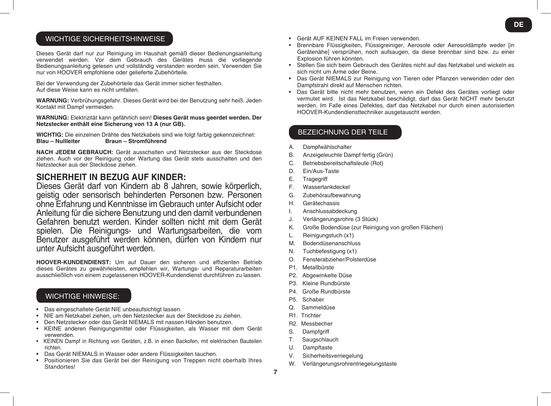 NACH JEDEM GEBRAUCH: Gerät ausschalten und Netzstecker aus der Steckdose ziehen. Auch vor der Reinigung oder Wartung das Gerät stets ausschalten und den Netzstecker aus der Steckdose ziehen. SICHERHEIT IN BEZUG AUF KINDER: Dieses Gerät darf von Kindern ab 8 Jahren, sowie körperlich, geistig oder sensorisch behinderten Personen bzw. Personen ohne Erfahrung und Kenntnisse im Gebrauch unter Aufsicht oder Anleitung für die sichere Benutzung und den damit verbundenen Gefahren benutzt werden. Kinder sollten nicht mit dem Gerät spielen. Die Reinigungs- und Wartungsarbeiten, die vom Benutzer ausgeführt werden können, dürfen von Kindern nur unter Aufsicht ausgeführt werden. HOOVER-KUNDENDIENST: Um auf Dauer den sicheren und effizienten Betrieb dieses Gerätes zu gewährleisten, empfehlen wir, Wartungs- und Reparaturarbeiten ausschließlich von einem zugelassenen HOOVER-Kundendienst durchführen zu lassen. WICHTIGE HINWEISE: Das eingeschaltete Gerät NIE unbeaufsichtigt lassen. NIE am Netzkabel ziehen, um den Netzstecker aus der Steckdose zu ziehen. Den Netzstecker oder das Gerät NIEMALS mit nassen Händen benutzen. KEINE anderen Reinigungsmittel oder Flüssigkeiten, als Wasser mit dem Gerät verwenden.