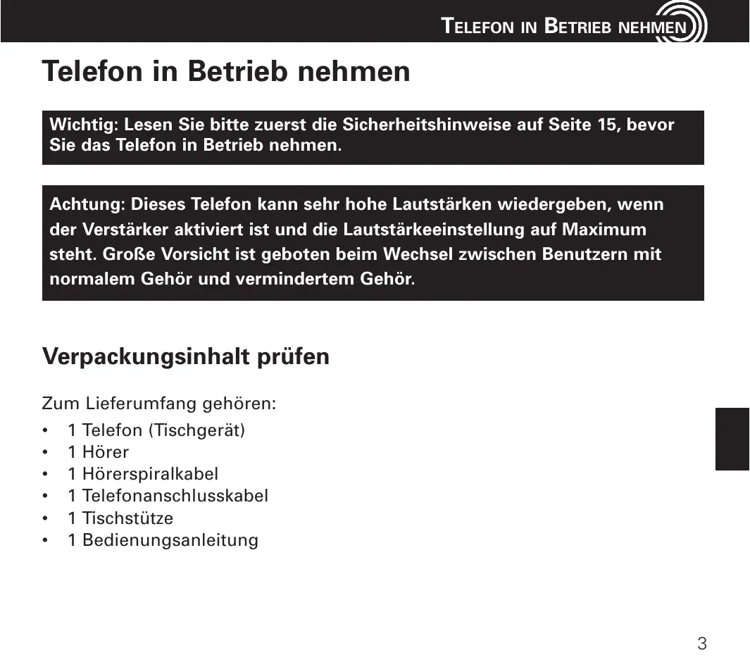 BETRIEB NEHMEN Telefon in Betrieb nehmen Wichtig: Lesen Sie bitte zuerst die Sicherheitshinweise auf Seite 15, bevor Sie das Telefon in Betrieb nehmen. Achtung: Dieses Telefon kann sehr hohe Lautstärken wiedergeben, wenn der Verstärker aktiviert ist und die Lautstärkeeinstellung auf Maximum steht. Große Vorsicht ist geboten beim Wechsel zwischen Benutzern mit normalem Gehör und vermindertem Gehör. Verpackungsinhalt prüfen Zum Lieferumfang gehören: