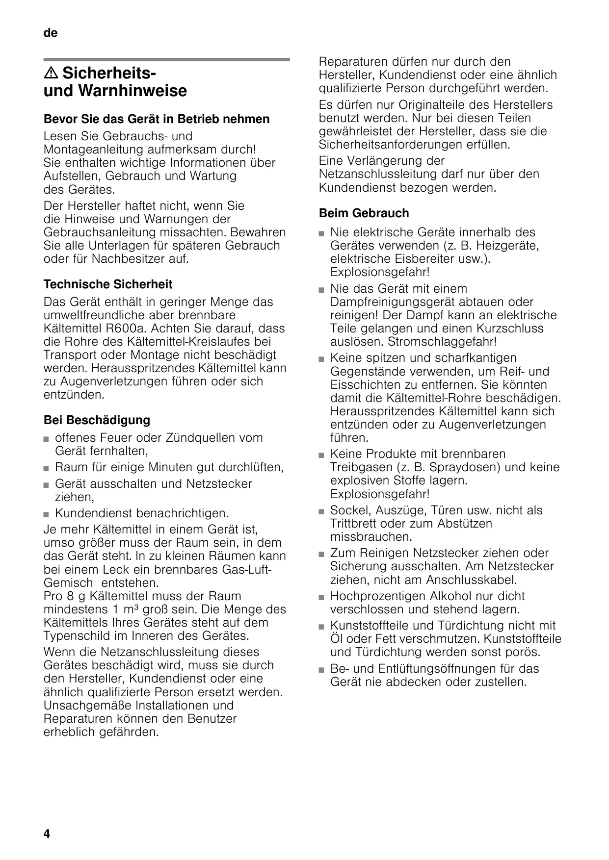 m Sicherheits- und Warnhinweise Bevor Sie das Gerät in Betrieb nehmen Lesen Sie Gebrauchs- und Montageanleitung aufmerksam durch! Sie enthalten wichtige Informationen über Aufstellen, Gebrauch und Wartung des Gerätes. Der Hersteller haftet nicht, wenn Sie die Hinweise und Warnungen der Gebrauchsanleitung missachten. Bewahren Sie alle Unterlagen für späteren Gebrauch oder für Nachbesitzer auf. Technische Sicherheit Das Gerät enthält in geringer Menge das umweltfreundliche aber brennbare Kältemittel R600a. Achten Sie darauf, dass die Rohre des Kältemittel-Kreislaufes bei Transport oder Montage nicht beschädigt werden. Herausspritzendes Kältemittel kann zu Augenverletzungen führen oder sich entzünden. Bei Beschädigung ■ offenes Feuer oder Zündquellen vom Gerät fernhalten, ■ Raum für einige Minuten gut durchlüften, ■ Gerät ausschalten und Netzstecker ziehen, ■ Kundendienst benachrichtigen. Je mehr Kältemittel in einem Gerät ist, umso größer muss der Raum sein, in dem das Gerät steht. In zu kleinen Räumen kann bei einem Leck ein brennbares Gas-LuftGemisch entstehen. Pro 8 g Kältemittel muss der Raum mindestens 1 m³ groß sein. Die Menge des Kältemittels Ihres Gerätes steht auf dem Typenschild im Inneren des Gerätes. Wenn die Netzanschlussleitung dieses Gerätes beschädigt wird, muss sie durch den Hersteller, Kundendienst oder eine ähnlich qualifizierte Person ersetzt werden. Unsachgemäße Installationen und Reparaturen können den Benutzer erheblich gefährden.