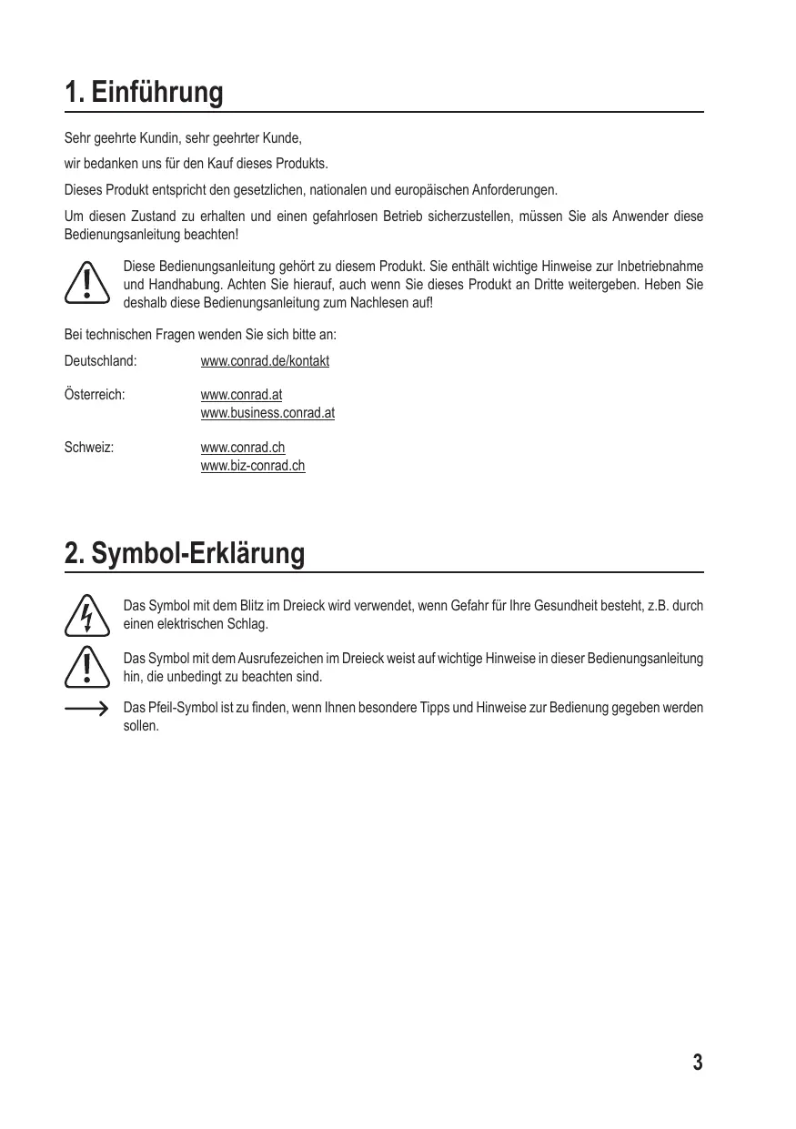 Sehr geehrte Kundin, sehr geehrter Kunde, wir bedanken uns für den Kauf dieses Produkts. Dieses Produkt entspricht den gesetzlichen, nationalen und europäischen Anforderungen. Um diesen Zustand zu erhalten und einen gefahrlosen Betrieb sicherzustellen, müssen Sie als Anwender diese Bedienungsanleitung beachten! Diese Bedienungsanleitung gehört zu diesem Produkt. Sie enthält wichtige Hinweise zur Inbetriebnahme und Handhabung. Achten Sie hierauf, auch wenn Sie dieses Produkt an Dritte weitergeben. Heben Sie deshalb diese Bedienungsanleitung zum Nachlesen auf! Bei technischen Fragen wenden Sie sich bitte an: Deutschland: www.conrad.de/kontakt Österreich: www.conrad.at www.business.conrad.at Schweiz: www.conrad.ch www.biz-conrad.ch