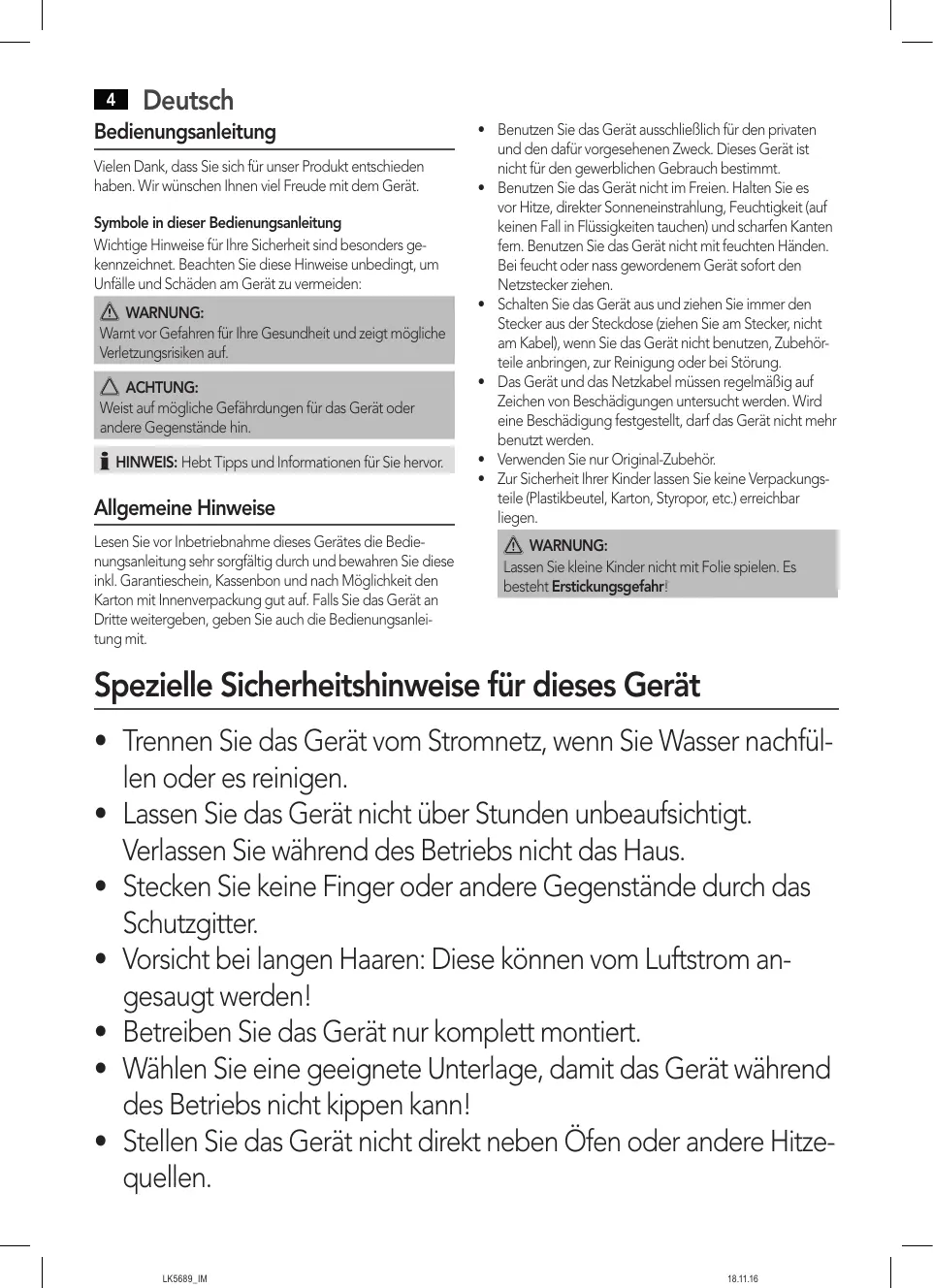 - Lassen Sie das Gerät nicht über Stunden unbeaufsichtigt. Verlassen Sie während des Betriebs nicht das Haus.