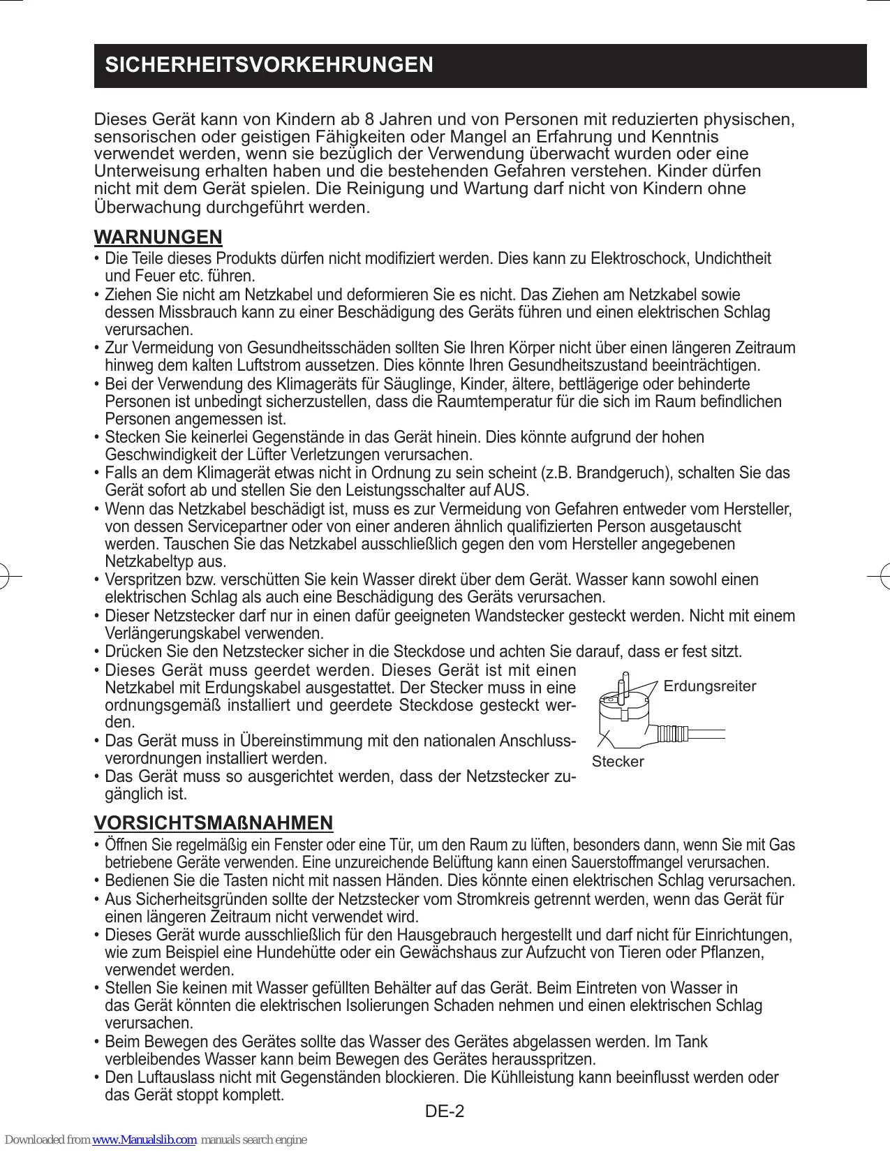 • Öffnen Sie regelmäßig ein Fenster oder eine Tür, um den Raum zu lüften, besonders dann, wenn Sie mit Gas betriebene Geräte verwenden. Eine unzureichende Belüftung kann einen Sauerstoffmangel verursachen. • Bedienen Sie die Tasten nicht mit nassen Händen. Dies könnte einen elektrischen Schlag verursachen. • Aus Sicherheitsgründen sollte der Netzstecker vom Stromkreis getrennt werden, wenn das Gerät für einen längeren Zeitraum nicht verwendet wird. • Dieses Gerät wurde ausschließlich für den Hausgebrauch hergestellt und darf nicht für Einrichtungen, wie zum Beispiel eine Hundehütte oder ein Gewächshaus zur Aufzucht von Tieren oder Pflanzen, verwendet werden. • Stellen Sie keinen mit Wasser gefüllten Behälter auf das Gerät. Beim Eintreten von Wasser in das Gerät könnten die elektrischen Isolierungen Schaden nehmen und einen elektrischen Schlag verursachen. • Beim Bewegen des Gerätes sollte das Wasser des Gerätes abgelassen werden. Im Tank verbleibendes Wasser kann beim Bewegen des Gerätes herausspritzen. • Den Luftauslass nicht mit Gegenständen blockieren. Die Kühlleistung kann beeinflusst werden oder das Gerät stoppt komplett. DE-2 Downloaded from www.Manualslib.com manuals search engine