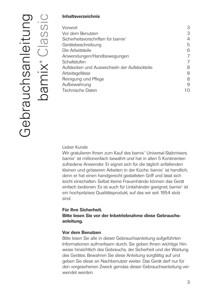 Gebrauchsanleitung bamix Classic Inhaltsverzeichnis Vorwort Vor dem Benutzen Sicherheitsvorschriften für bamix Gerätebeschreibung Die Arbeitsteile Anwendungen/Handbewegungen Schaltstufen Aufstecken und Auswechseln der Aufsteckteile Arbeitsgefässe Reinigung und Pflege Aufbewahrung Technische Daten