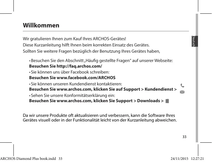 Si vous avez plus de questions concernant l’utilisation de votre appareil, • Vous pouvez consulter la foire aux questions sur notre site Web : allez sur http://faq.archos.com/ • Vous pouvez nous envoyer un message sur Facebook : allez sur www.facebook.com/ARCHOS • Vous pouvez contacter notre service après-vente : allez sur www.archos.com, cliquez sur Support > Service après-vente > • Vous pouvez consulter la déclaration de conformité : allez sur www.archos.com, cliquez sur Support > Téléchargements > Comme nous mettons à jour et améliorons régulièrement nos produits, le logiciel de votre appareil peut présenter une interface ou des fonctionnalités légèrement différentes de celles décrites dans ce guide.