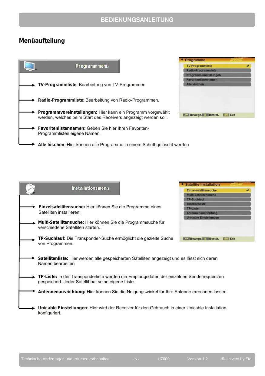 Einzelsatellitensuche: Hier können Sie die Programme eines Satelliten installieren. Multi-Satellitensuche: Hier können Sie die Programmsuche für verschiedene Satelliten starten. TP-Suchlauf: Die Transponder-Suche ermöglicht die gezielte Suche von Programmen. Satellitenliste: Hier werden alle gespeicherten Satelliten angezeigt und es lässt sich deren Namen bearbeiten TP-Liste: In der Transponderliste werden die Empfangsdaten der einzelnen Sendefrequenzen gespeichert. Jeder Satellit hat seine eigene Liste. Antennenausrichtung: Hier können Sie die Neigungswinkel für Ihre Antenne errechnen lassen. Unicable Einstellungen: Hier wird der Receiver für den Gebrauch in einer Unicable Installation konfiguriert.