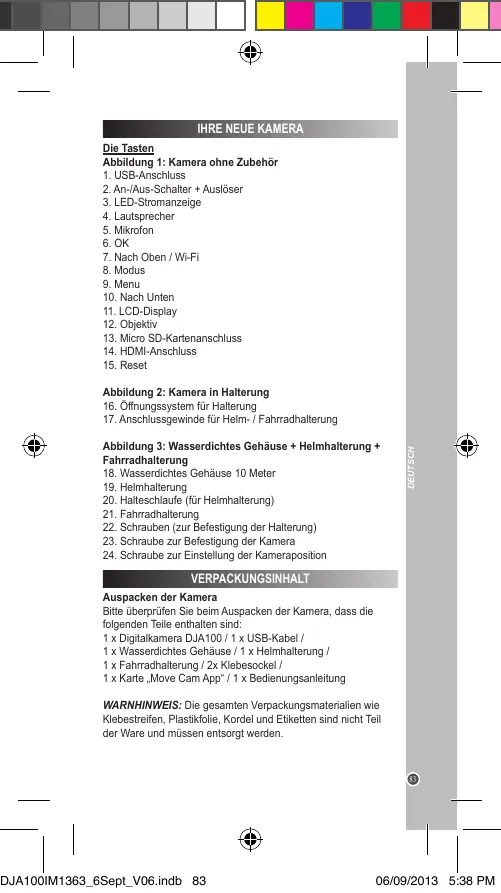 VERPACKUNGSINHALT Auspacken der Kamera Bitte überprüfen Sie beim Auspacken der Kamera, dass die folgenden Teile enthalten sind: 1 x Digitalkamera DJA100 / 1 x USB-Kabel / 1 x Wasserdichtes Gehäuse / 1 x Helmhalterung / 1 x Fahrradhalterung / 2x Klebesockel / 1 x Karte „Move Cam App“ / 1 x Bedienungsanleitung WARNHINWEIS: Die gesamten Verpackungsmaterialien wie Klebestreifen, Plastikfolie, Kordel und Etiketten sind nicht Teil der Ware und müssen entsorgt werden. DJA100IM1363_6Sept_V06.indb 83
