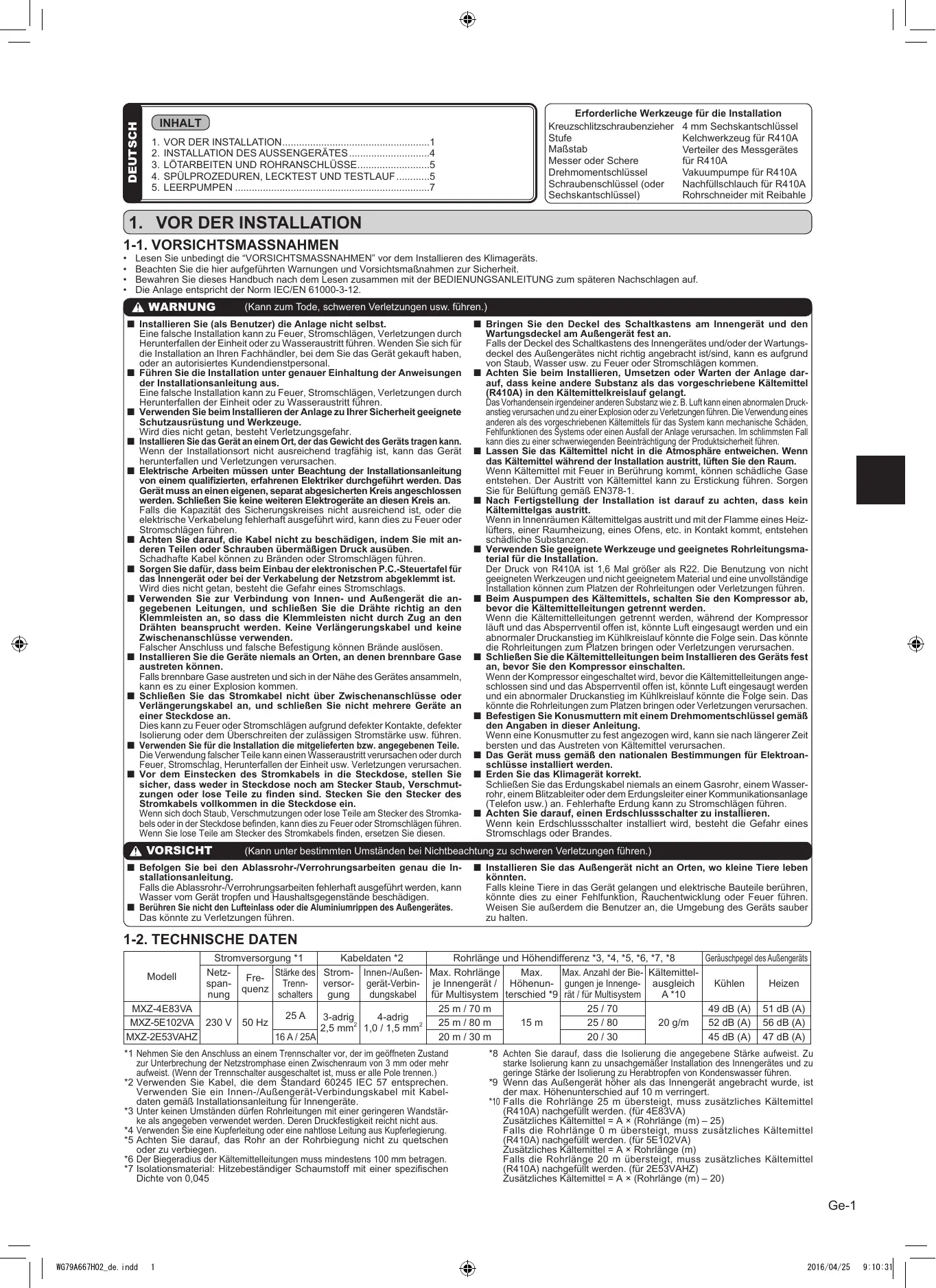 Lesen Sie unbedingt die “VORSICHTSMASSNAHMEN” vor dem Installieren des Klimageräts. Beachten Sie die hier aufgeführten Warnungen und Vorsichtsmaßnahmen zur Sicherheit. Bewahren Sie dieses Handbuch nach dem Lesen zusammen mit der BEDIENUNGSANLEITUNG zum späteren Nachschlagen auf. Die Anlage entspricht der Norm IEC/EN 61000-3-12.
