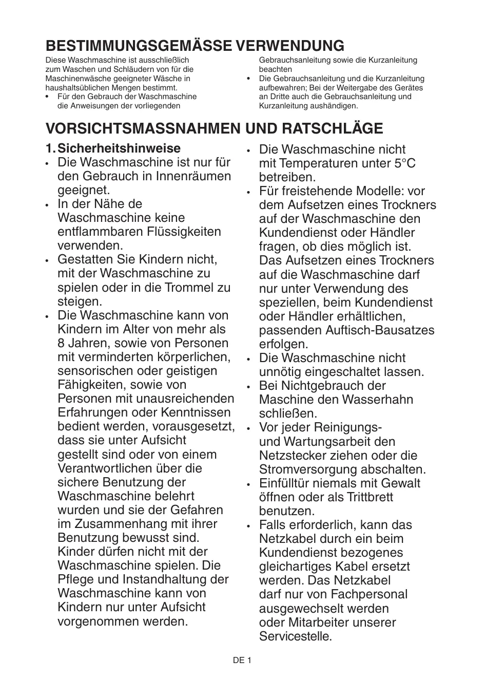 • Die Waschmaschine kann von Kindern im Alter von mehr als 8 Jahren, sowie von Personen mit verminderten körperlichen, sensorischen oder geistigen Fähigkeiten, sowie von Personen mit unausreichenden Erfahrungen oder Kenntnissen bedient werden, vorausgesetzt, dass sie unter Aufsicht gestellt sind oder von einem Verantwortlichen über die sichere Benutzung der Waschmaschine belehrt wurden und sie der Gefahren im Zusammenhang mit ihrer Benutzung bewusst sind. Kinder dürfen nicht mit der Waschmaschine spielen. Die Pflege und Instandhaltung der Waschmaschine kann von Kindern nur unter Aufsicht vorgenommen werden.