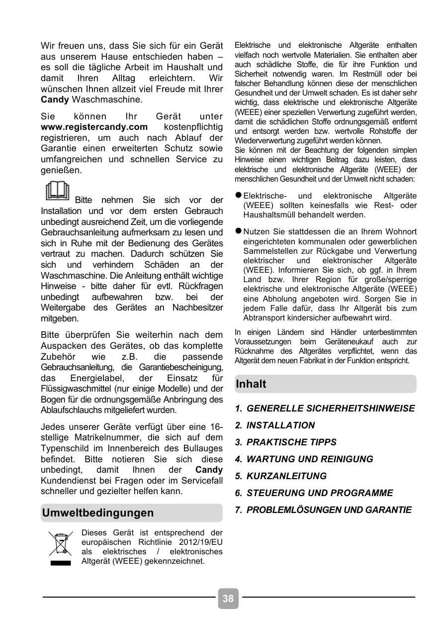 L’utilizzo di detersivi ecologici senza fosfati può produrre i seguenti effetti: Wir freuen uns, dass Sie sich für ein Gerät aus unserem Hause entschieden haben – es soll die tägliche Arbeit im Haushalt und damit Ihren Alltag erleichtern. Wir wünschen Ihnen allzeit viel Freude mit Ihrer Candy Waschmaschine. Sie können Ihr Gerät unter www.registercandy.com kostenpflichtig registrieren, um auch nach Ablauf der Garantie einen erweiterten Schutz sowie umfangreichen und schnellen Service zu genießen. Bitte nehmen Sie sich vor der Installation und vor dem ersten Gebrauch unbedingt ausreichend Zeit, um die vorliegende Gebrauchsanleitung aufmerksam zu lesen und sich in Ruhe mit der Bedienung des Gerätes vertraut zu machen. Dadurch schützen Sie sich und verhindern Schäden an der Waschmaschine. Die Anleitung enthält wichtige Hinweise - bitte daher für evtl. Rückfragen unbedingt aufbewahren bzw. bei der Weitergabe des Gerätes an Nachbesitzer mitgeben. Elektrische und elektronische Altgeräte enthalten vielfach noch wertvolle Materialien. Sie enthalten aber auch schädliche Stoffe, die für ihre Funktion und Sicherheit notwendig waren. Im Restmüll oder bei falscher Behandlung können diese der menschlichen Gesundheit und der Umwelt schaden. Es ist daher sehr wichtig, dass elektrische und elektronische Altgeräte (WEEE) einer speziellen Verwertung zugeführt werden, damit die schädlichen Stoffe ordnungsgemäß entfernt und entsorgt werden bzw. wertvolle Rohstoffe der Wiederverwertung zugeführt werden können. Sie können mit der Beachtung der folgenden simplen Hinweise einen wichtigen Beitrag dazu leisten, dass elektrische und elektronische Altgeräte (WEEE) der menschlichen Gesundheit und der Umwelt nicht schaden: l Elektrische- und elektronische Altgeräte (WEEE) sollten keinesfalls wie Rest- oder Haushaltsmüll behandelt werden. l Nutzen Sie stattdessen die an Ihrem Wohnort eingerichteten kommunalen oder gewerblichen Sammelstellen zur Rückgabe und Verwertung elektrischer und elektronischer Altgeräte (WEEE). Informieren Sie sich, ob ggf. in Ihrem Land bzw. Ihrer Region für große/sperrige elektrische und elektronische Altgeräte (WEEE) eine Abholung angeboten wird. Sorgen Sie in jedem Falle dafür, dass Ihr Altgerät bis zum Abtransport kindersicher aufbewahrt wird. Bitte überprüfen Sie weiterhin nach dem Auspacken des Gerätes, ob das komplette Zubehör wie z.B. die passende Gebrauchsanleitung, die Garantiebescheinigung, das Energielabel, der Einsatz für Flüssigwaschmittel (nur einige Modelle) und der Bogen für die ordnungsgemäße Anbringung des Ablaufschlauchs mitgeliefert wurden. In einigen Ländern sind Händler unterbestimmten Voraussetzungen beim Geräteneukauf auch zur Rücknahme des Altgerätes verpflichtet, wenn das Altgerät dem neuen Fabrikat in der Funktion entspricht. Jedes unserer Geräte verfügt über eine 16stellige Matrikelnummer, die sich auf dem Typenschild im Innenbereich des Bullauges befindet. Bitte notieren Sie sich diese unbedingt, damit Ihnen der Candy Kundendienst bei Fragen oder im Servicefall schneller und gezielter helfen kann.