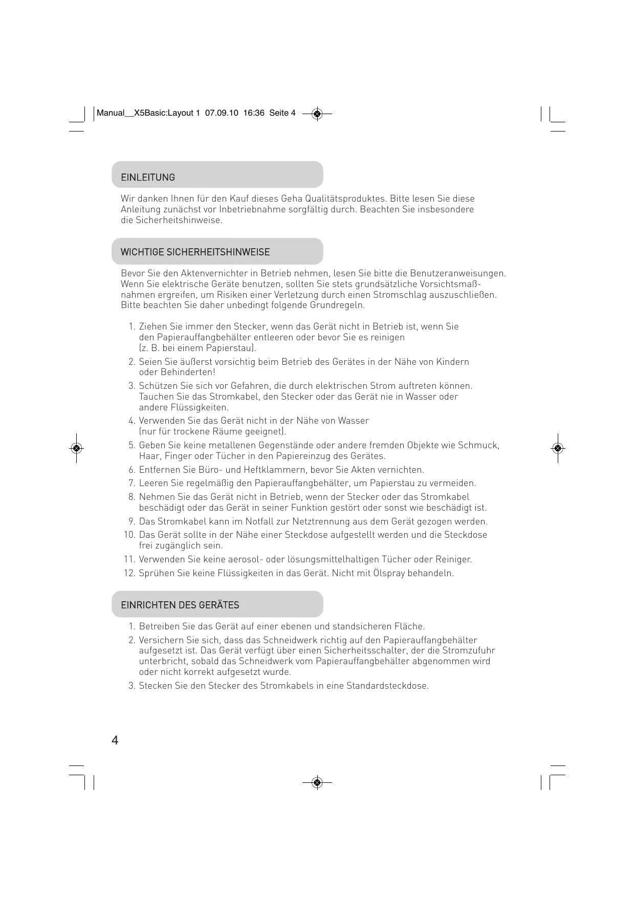 Manual__X5Basic:Layout 1 07.09.10 16:36 Seite 4 EINLEITUNG Wir danken Ihnen für den Kauf dieses Geha Qualitätsproduktes. Bitte lesen Sie diese Anleitung zunächst vor Inbetriebnahme sorgfältig durch. Beachten Sie insbesondere die Sicherheitshinweise. WICHTIGE SICHERHEITSHINWEISE Bevor Sie den Aktenvernichter in Betrieb nehmen, lesen Sie bitte die Benutzeranweisungen. Wenn Sie elektrische Geräte benutzen, sollten Sie stets grundsätzliche Vorsichtsmaßnahmen ergreifen, um Risiken einer Verletzung durch einen Stromschlag auszuschließen. Bitte beachten Sie daher unbedingt folgende Grundregeln.