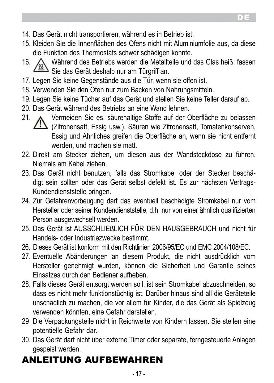DE 14. Das Gerät nicht transportieren, während es in Betrieb ist. 15. Kleiden Sie die Innenflächen des Ofens nicht mit Aluminiumfolie aus, da diese die Funktion des Thermostats schwer schädigen könnte. 16. Während des Betriebs werden die Metallteile und das Glas heiß: fassen Sie das Gerät deshalb nur am Türgriff an. 17. Legen Sie keine Gegenstände aus die Tür, wenn sie offen ist. 18. Verwenden Sie den Ofen nur zum Backen von Nahrungsmitteln. 19. Legen Sie keine Tücher auf das Gerät und stellen Sie keine Teller darauf ab. 20. Das Gerät während des Betriebs an eine Wand lehnen. 21. Vermeiden Sie es, säurehaltige Stoffe auf der Oberfläche zu belassen (Zitronensaft, Essig usw.). Säuren wie Zitronensaft, Tomatenkonserven, Essig und Ähnliches greifen die Oberfläche an, wenn sie nicht entfernt werden, und machen sie matt. 22. Direkt am Stecker ziehen, um diesen aus der Wandsteckdose zu führen. Niemals am Kabel ziehen. 23. Das Gerät nicht benutzen, falls das Stromkabel oder der Stecker beschädigt sein sollten oder das Gerät selbst defekt ist. Es zur nächsten VertragsKundendienststelle bringen. 24. Zur Gefahrenvorbeugung darf das eventuell beschädigte Stromkabel nur vom Hersteller oder seiner Kundendienststelle, d.h. nur von einer ähnlich qualifizierten Person ausgewechselt werden. 25. Das Gerät ist AUSSCHLIEßLICH FÜR DEN HAUSGEBRAUCH und nicht für Handels- oder Industriezwecke bestimmt. 26. Dieses Gerät ist konform mit den Richtlinien 2006/95/EC und EMC 2004/108/EC. 27. Eventuelle Abänderungen an diesem Produkt, die nicht ausdrücklich vom Hersteller genehmigt wurden, können die Sicherheit und Garantie seines Einsatzes durch den Bediener aufheben. 28. Falls dieses Gerät entsorgt werden soll, ist sein Stromkabel abzuschneiden, so dass es nicht mehr funktionstüchtig ist. Darüber hinaus sind all die Geräteteile unschädlich zu machen, die vor allem für Kinder, die das Gerät als Spielzeug verwenden könnten, eine Gefahr darstellen. 29. Die Verpackungsteile nicht in Reichweite von Kindern lassen. Sie stellen eine potentielle Gefahr dar. 30. Das Gerät darf nicht über externe Timer oder separate, ferngesteuerte Anlagen gespeist werden.