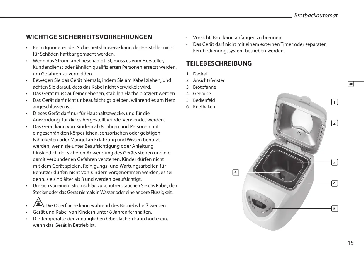 Vorsicht! Brot kann anfangen zu brennen. Das Gerät darf nicht mit einem externen Timer oder separaten Fernbedienungssystem betrieben werden. TEILEBESCHREIBUNG