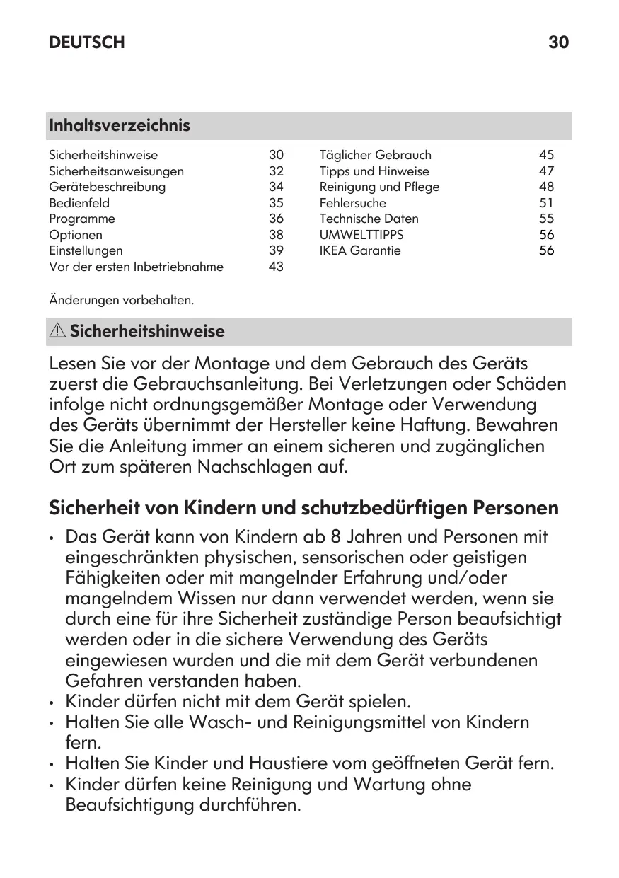 Inhalten des Benutzerhandbuchs und zu Spezifikationen des IKEA Geräts.