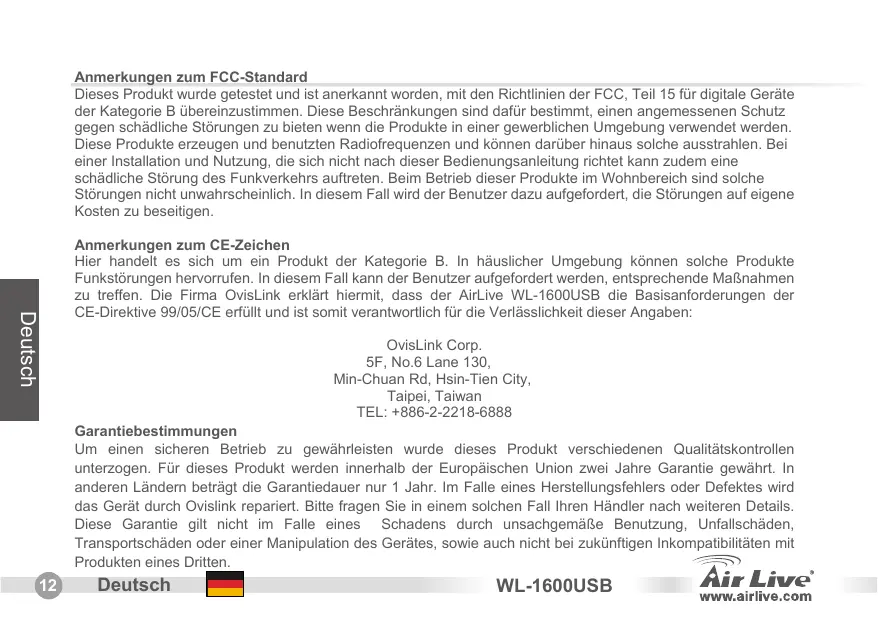 Anmerkungen zum FCC-Standard Dieses Produkt wurde getestet und ist anerkannt worden, mit den Richtlinien der FCC, Teil 15 für digitale Geräte der Kategorie B übereinzustimmen. Diese Beschränkungen sind dafür bestimmt, einen angemessenen Schutz gegen schädliche Störungen zu bieten wenn die Produkte in einer gewerblichen Umgebung verwendet werden. Diese Produkte erzeugen und benutzten Radiofrequenzen und können darüber hinaus solche ausstrahlen. Bei einer Installation und Nutzung, die sich nicht nach dieser Bedienungsanleitung richtet kann zudem eine schädliche Störung des Funkverkehrs auftreten. Beim Betrieb dieser Produkte im Wohnbereich sind solche Störungen nicht unwahrscheinlich. In diesem Fall wird der Benutzer dazu aufgefordert, die Störungen auf eigene Kosten zu beseitigen. Deutsch Anmerkungen zum CE-Zeichen Hier handelt es sich um ein Produkt der Kategorie B. In häuslicher Umgebung können solche Produkte Funkstörungen hervorrufen. In diesem Fall kann der Benutzer aufgefordert werden, entsprechende Maßnahmen zu treffen. Die Firma OvisLink erklärt hiermit, dass der AirLive WL-1600USB die Basisanforderungen der CE-Direktive 99/05/CE erfüllt und ist somit verantwortlich für die Verlässlichkeit dieser Angaben: OvisLink Corp. 5F, No.6 Lane 130, Min-Chuan Rd, Hsin-Tien City, Taipei, Taiwan