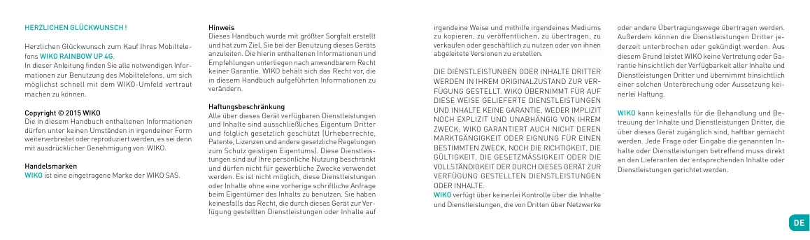 Dziekujemy za zakup Telefonu komorkowo go WIKO RAINBOW UP 4G. W tym podrzejniku znajdieszne niedzne informacja do uzytkowania tego Telefonu komorkowo i poznania Swiota WIKO.Copyright © 2015 WIKO