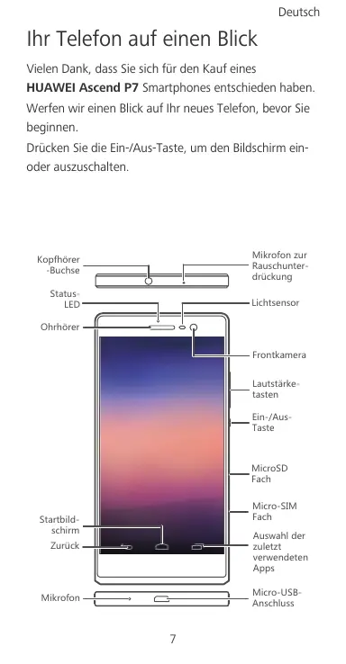 Deutsch Ihr Telefon auf einen Blick Vielen Dank, dass Sie sich für den Kauf eines HUAWEI Ascend P7 Smartphones entschieden haben. Werfen wir einen Blick auf Ihr neues Telefon, bevor Sie beginnen. Drücken Sie die Ein-/Aus-Taste, um den Bildschirm einoder auszuschalten. 3OQXULUT`[X