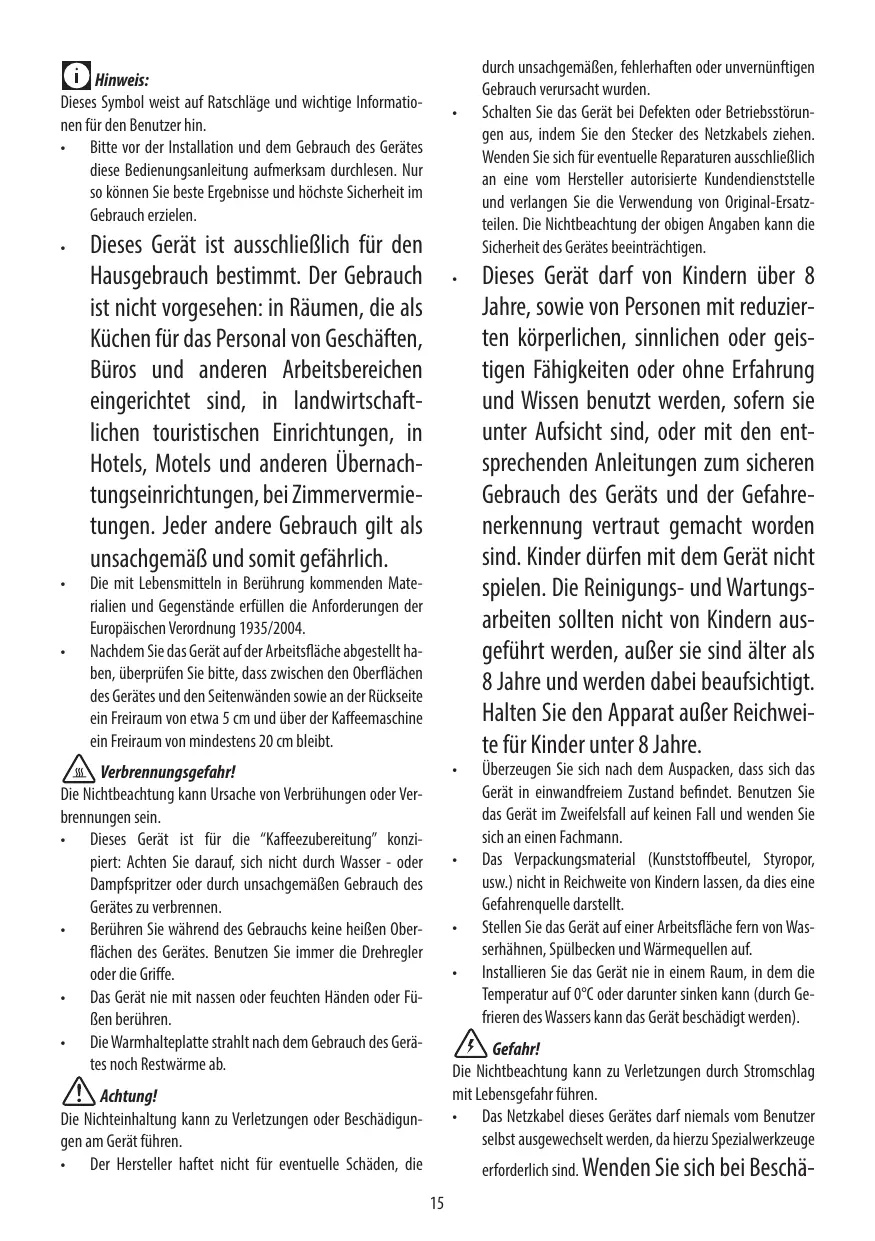Les matières et les objets destinés au contact avec des produits alimentaires sont conformes au règlement européen 1935/2004. Après avoir placé l’appareil sur le plan de travail, assurez-vous qu’il reste un espace d’environ 5 cm tout autour de la machine à café et de 20 cm au moins au-dessus.