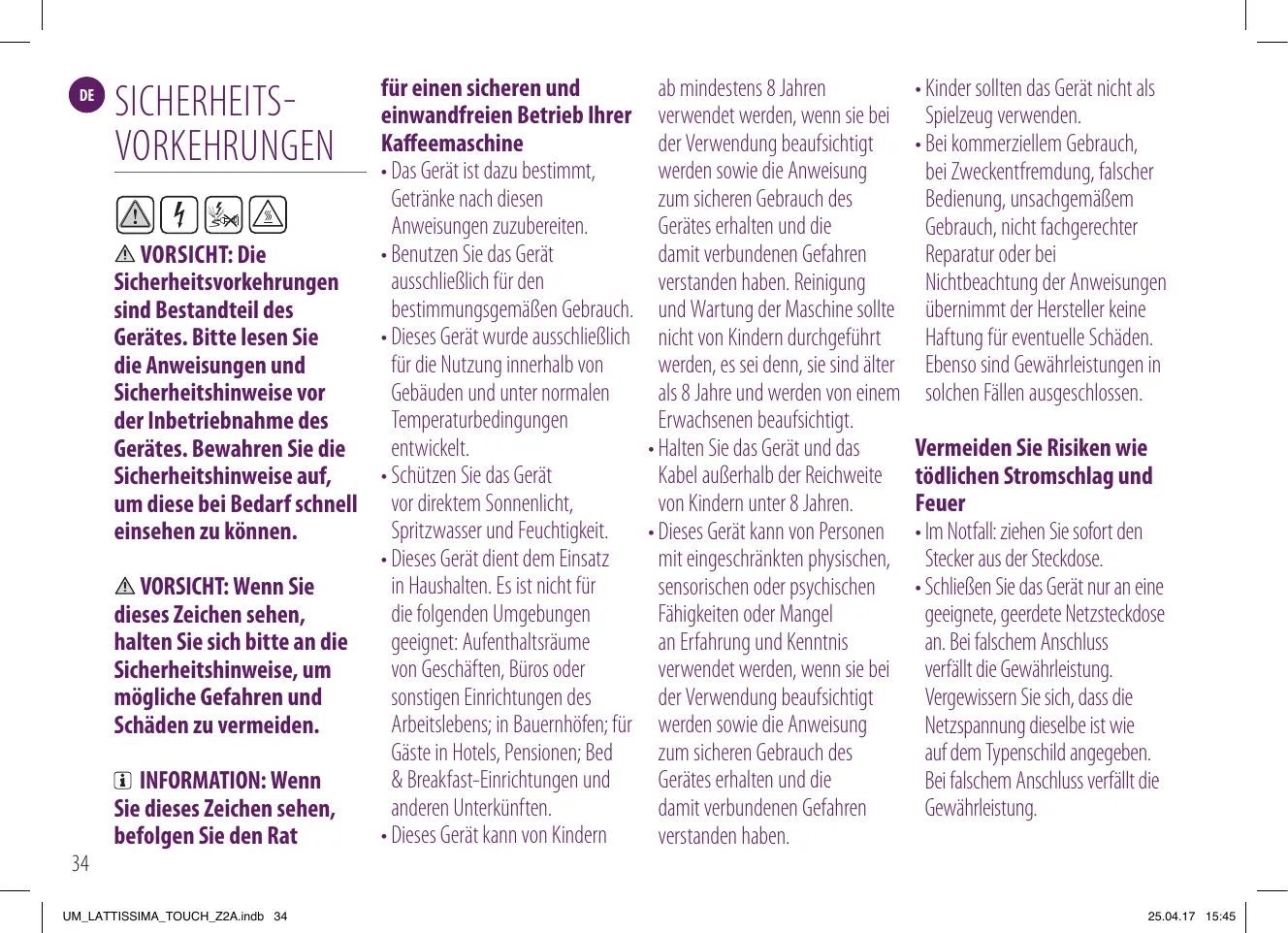 âgés de plus de 8 ans et qu’ils soient sous la surveillance d’un adulte. • Conservez l’appareil et son câble hors de portée des enfants âgés de moins de 8 ans. • Cet appareil peut être utilisé par des personnes dont les capacités physiques, sensorielles ou mentales sont réduites ou dont l’expérience ou les connaissances ne sont pas suffisantes, à condition qu’ils bénéficient d’une surveillance ou qu’ils aient reçu des instructions quant à l’utilisation de l’appareil en toute sécurité et qu’ils comprennent bien les dangers encourus. • Les enfants ne doivent pas utiliser l’appareil comme un jouet. • Le fabricant décline toute responsabilité et la garantie ne s’appliquera pas en cas d’usage 25.04.17 15:45